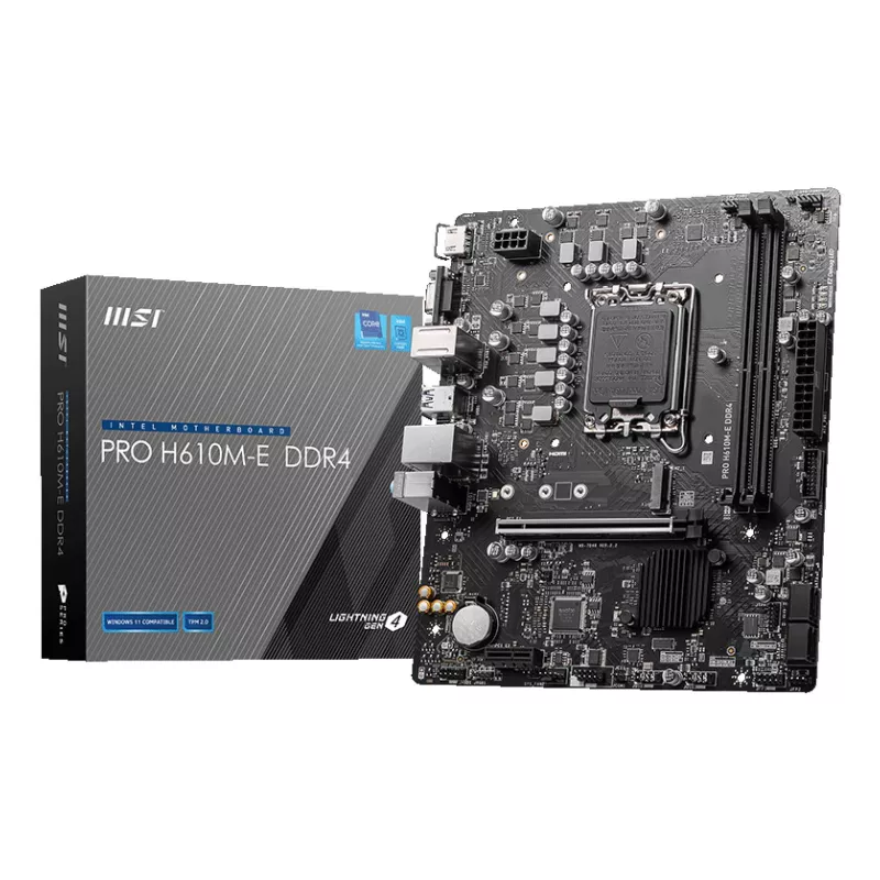 - MSI PRO H610M-E DDR4. PROCESSOR MANUFACTURER: INTEL, PROCESSOR SOCKET: LGA 1700, COMPATIBLE PROCESSOR SERIES: INTEL CORE I9. SUPPORTED MEMORY TYPES: DDR4-SDRAM, MAXIMUM INTERNAL MEMORY: 64 GB, MEMORY SLOTS TYPE: DIMM. SUPPORTED STORAGE DRIVE INTERFACES: M