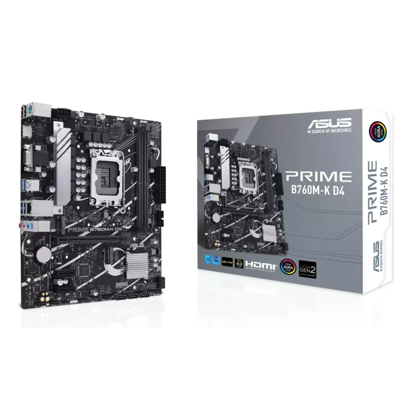 - ASUS PRIME B760M-K D4. PROCESSOR MANUFACTURER: INTEL, PROCESSOR SOCKET: LGA 1700, COMPATIBLE PROCESSOR SERIES: INTEL CELERON , INTEL CORE I3, INTEL CORE I5, INTEL CORE I7, INTEL CORE I9,.... SUPPORTED MEMORY TYPES: DDR4-SDRAM, MAXIMUM INTERNAL MEMORY: 64