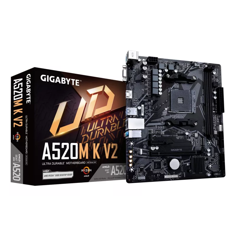 GIGABYTE A520M K V2 MOTHERBOARD - SUPPORTS AMD RYZEN 5000 SERIES AM4 CPUS, UP TO 5100MHZ DDR4 (OC), PCIE GEN3 X4 M.2, GBE LAN, USB 3.2 GEN 1. PROCESSOR MANUFACTURER: AMD, PROCESSOR SOCKET: SOCKET AM4, COMPATIBLE PROCESSOR SERIES: AMD RYZEN 3000 SERIES, AM