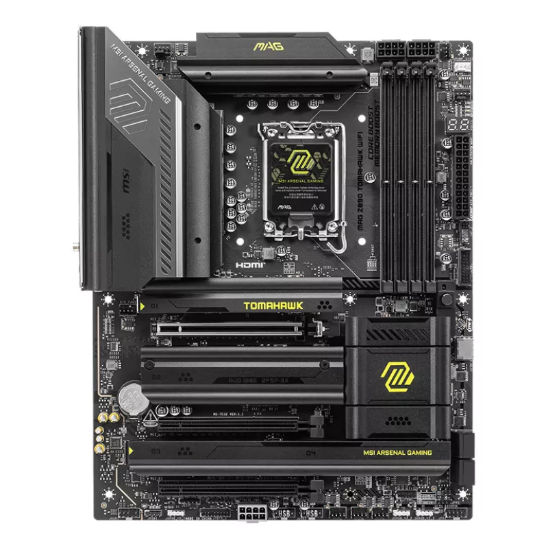 MSI MAG Z890 TOMAHAWK WIFI. PROCESSOR MANUFACTURER: INTEL, PROCESSOR SOCKET: LGA 1851 (SOCKET V1), COMPATIBLE PROCESSOR SERIES: INTEL CORE ULTRA (SERIES 2). SUPPORTED MEMORY TYPES: DDR5-SDRAM, MAXIMUM INTERNAL MEMORY: 256 GB, MEMORY SLOTS TYPE: DIMM. SUPP