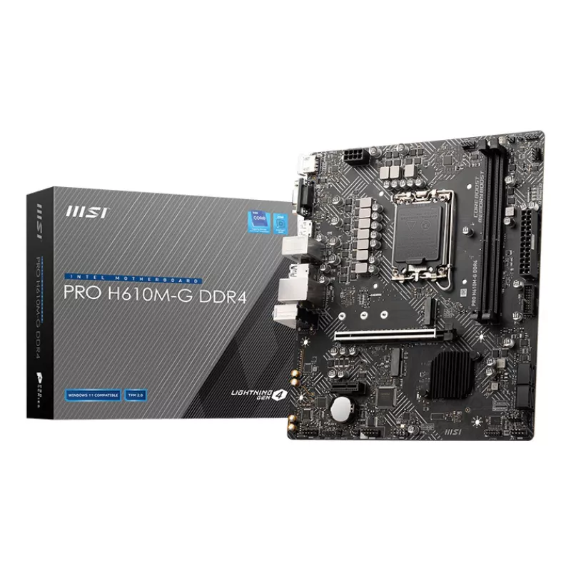 - MSI PRO H610M-G DDR4. PROCESSOR MANUFACTURER: INTEL, PROCESSOR SOCKET: LGA 1700, COMPATIBLE PROCESSOR SERIES: INTEL CORE I9. SUPPORTED MEMORY TYPES: DDR4-SDRAM, MAXIMUM INTERNAL MEMORY: 64 GB, MEMORY SLOTS TYPE: DIMM. SUPPORTED STORAGE DRIVE INTERFACES: M