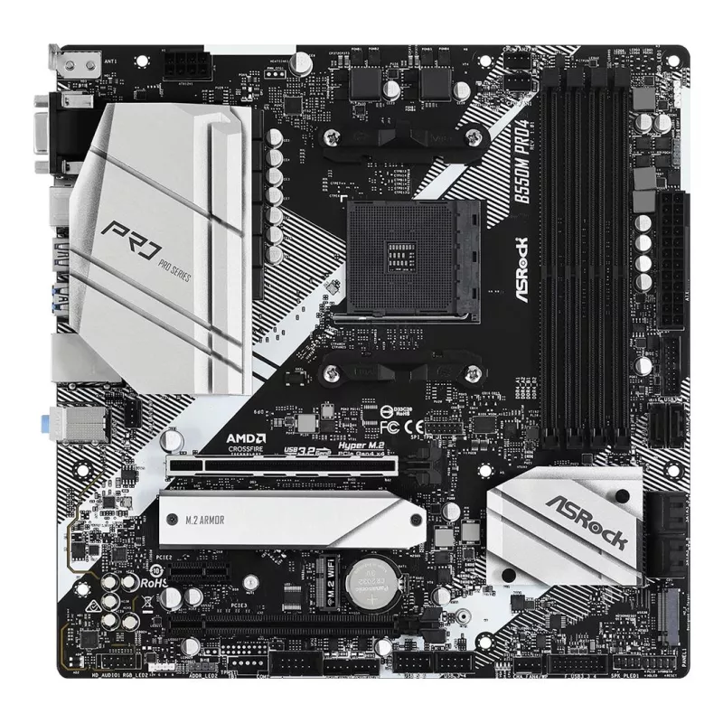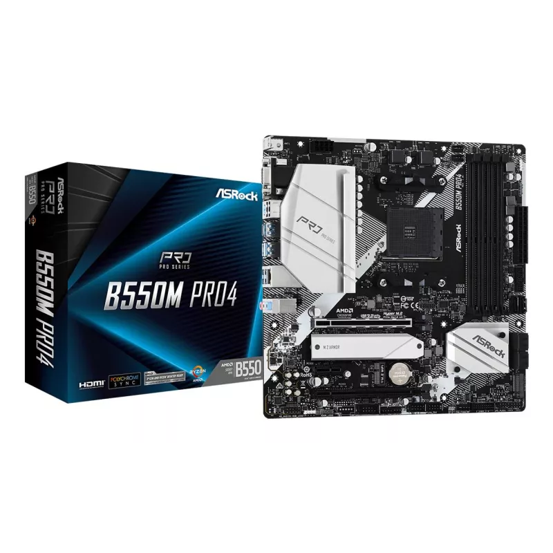 - ASROCK B550M PRO4. PROCESSOR MANUFACTURER: AMD, PROCESSOR SOCKET: SOCKET AM4, COMPATIBLE PROCESSOR SERIES: AMD RYZEN 3000 SERIES. SUPPORTED MEMORY TYPES: DDR4-SDRAM, MAXIMUM INTERNAL MEMORY: 128 GB, MEMORY SLOTS TYPE: DIMM. SUPPORTED STORAGE DRIVE INTERFA