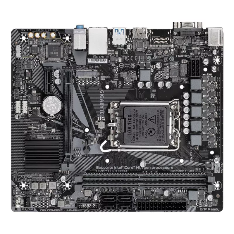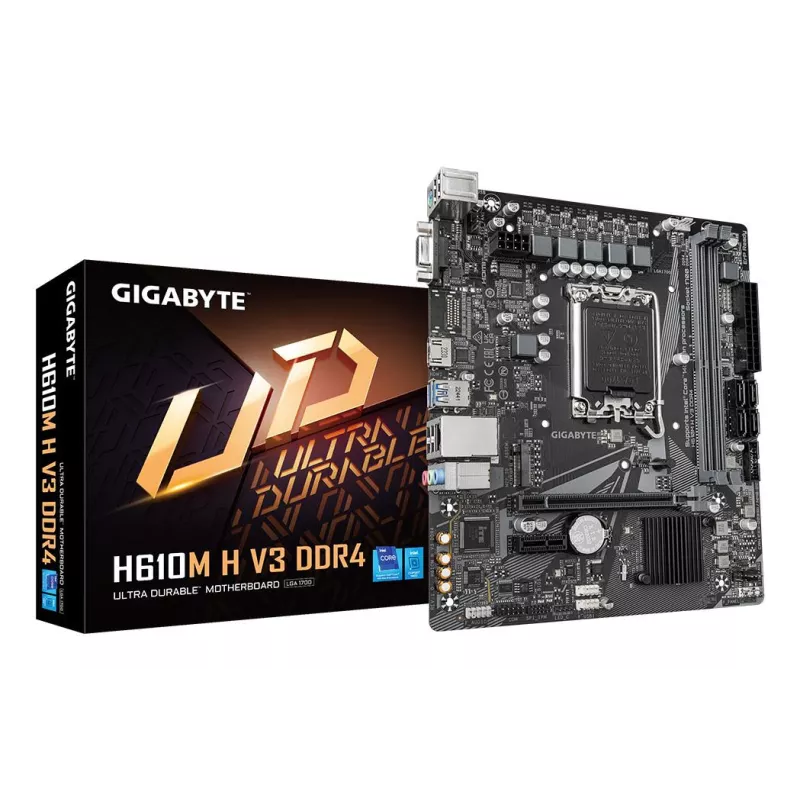 - GIGABYTE H610M H V3 DDR4 MOTHERBOARD - SUPPORTS INTEL CORE 14TH CPUS, 4+1+1 HYBRID PHASES DIGITAL VRM, UP TO 3200MHZ DDR4, 1XPCIE 3.0 M.2, GBE LAN, USB 3.2 GEN 1. PROCESSOR MANUFACTURER: INTEL, PROCESSOR SOCKET: LGA 1700, COMPATIBLE PROCESSOR SERIES: INTE