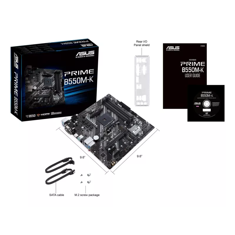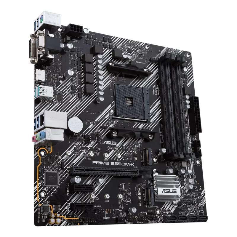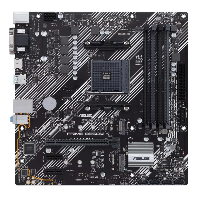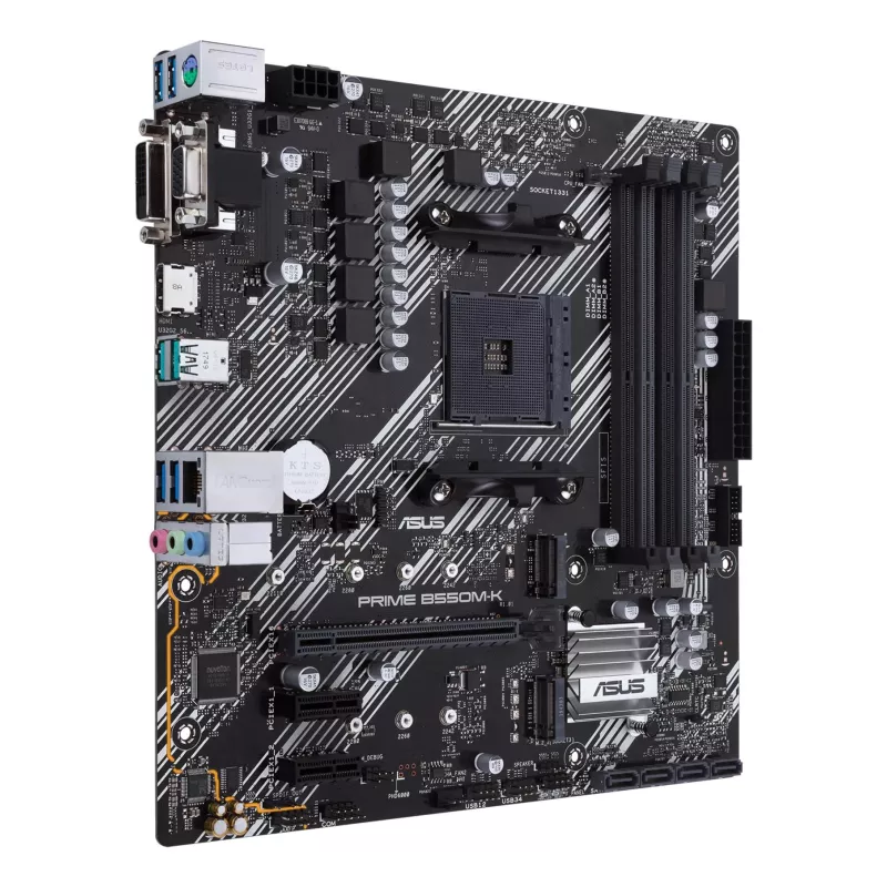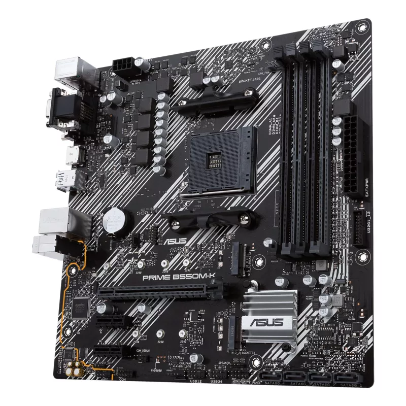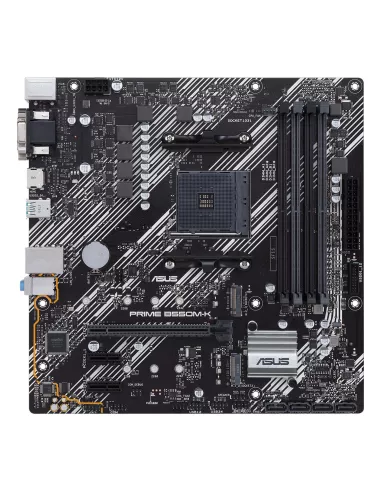ASUS PRIME B550M-K. PROCESSOR MANUFACTURER: AMD, PROCESSOR SOCKET: SOCKET AM4, COMPATIBLE PROCESSOR SERIES: AMD RYZEN 3000 SERIES. SUPPORTED MEMORY TYPES: DDR4-SDRAM, MAXIMUM INTERNAL MEMORY: 128 GB, MEMORY SLOTS TYPE: DIMM. SUPPORTED STORAGE DRIVE INTERF