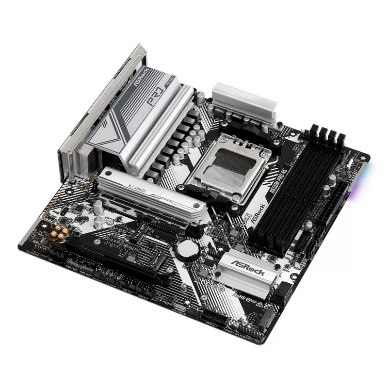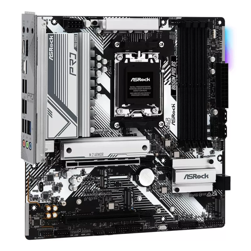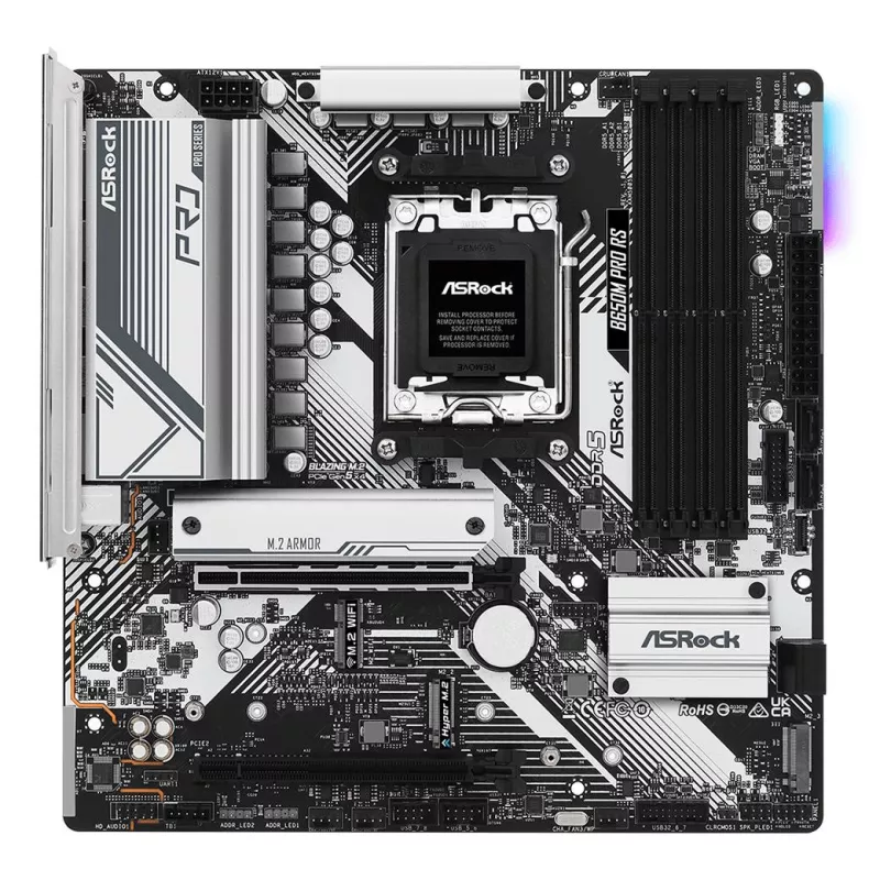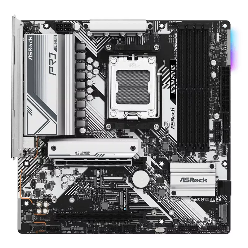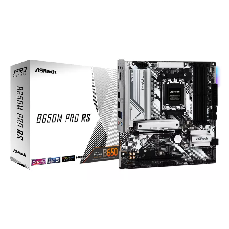 - ASROCK B650M PRO RS. PROCESSOR MANUFACTURER: AMD, PROCESSOR SOCKET: SOCKET AM5, COMPATIBLE PROCESSOR SERIES: AMD RYZEN 5, AMD RYZEN 7. SUPPORTED MEMORY TYPES: DDR5-SDRAM, MAXIMUM INTERNAL MEMORY: 128 GB, MEMORY SLOTS TYPE: DIMM. SUPPORTED STORAGE DRIVE IN