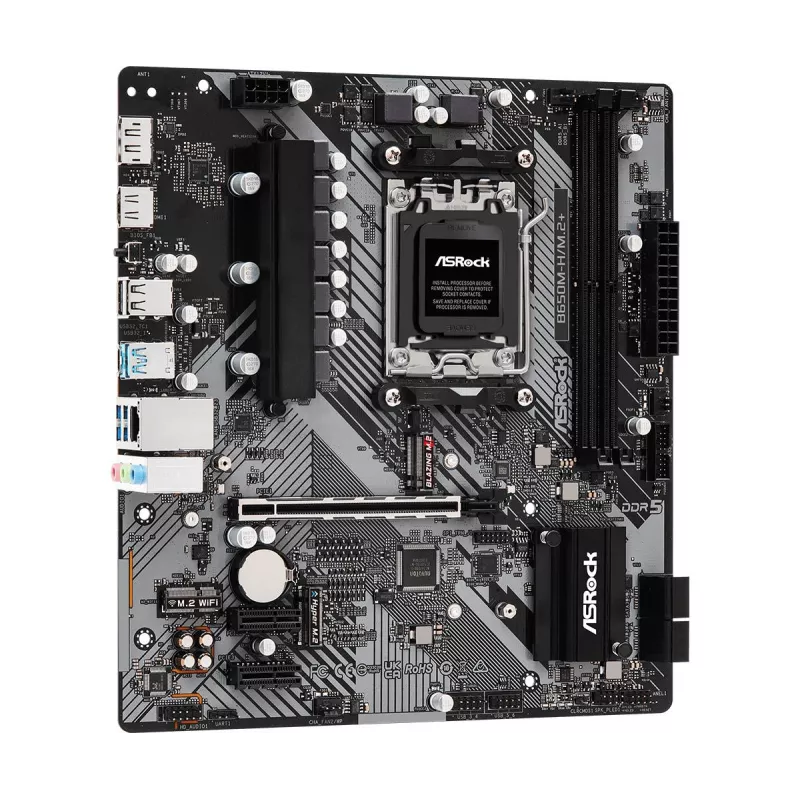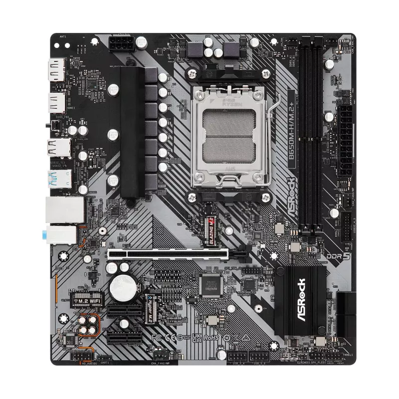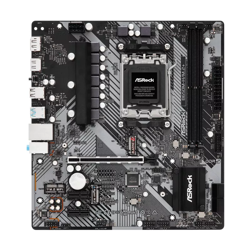 - ASROCK B650M-H/M.2+. PROCESSOR MANUFACTURER: AMD, PROCESSOR SOCKET: SOCKET AM5. SUPPORTED MEMORY TYPES: DDR5-SDRAM, MAXIMUM INTERNAL MEMORY: 96 GB, MEMORY SLOTS TYPE: DIMM. SUPPORTED STORAGE DRIVE INTERFACES: M.2, SATA III, RAID LEVELS: 0, 1, 10. GRAPHICS