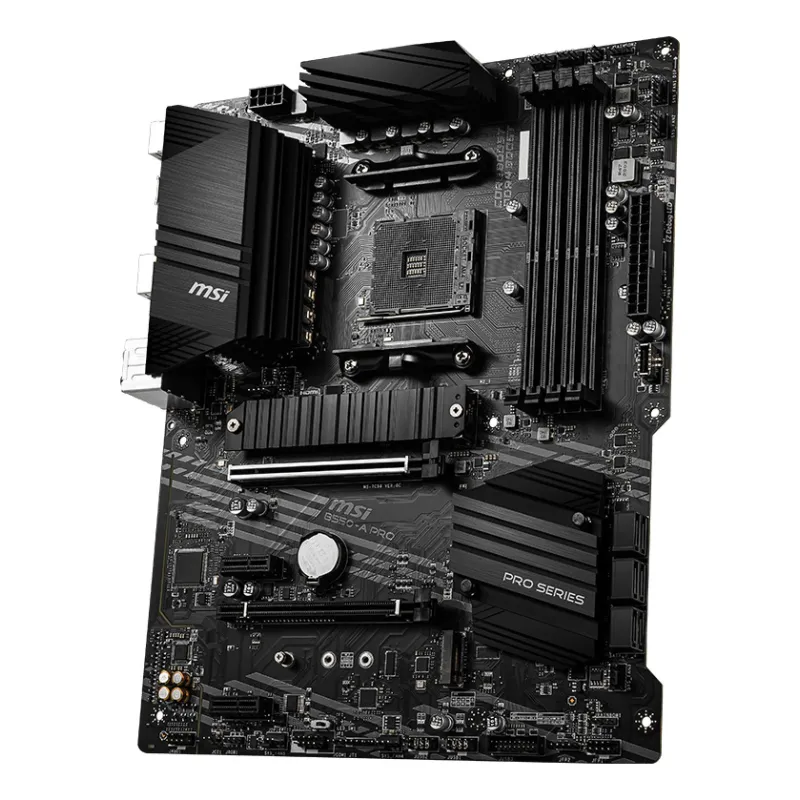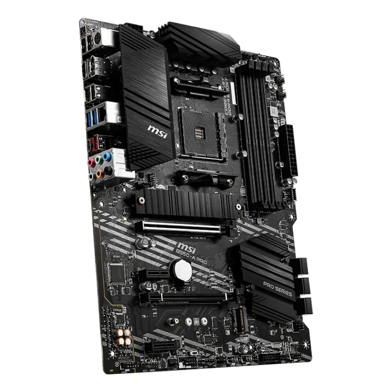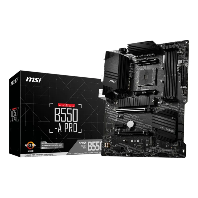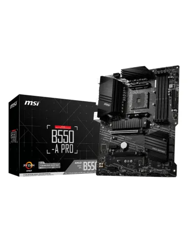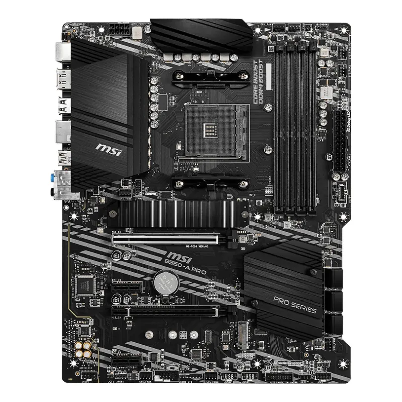 MSI B550-A PRO. PROCESSOR MANUFACTURER: AMD, PROCESSOR SOCKET: SOCKET AM4, COMPATIBLE PROCESSOR SERIES: AMD RYZEN 3000 SERIES. SUPPORTED MEMORY TYPES: DDR4-SDRAM, MAXIMUM INTERNAL MEMORY: 128 GB, MEMORY SLOTS TYPE: DIMM. SUPPORTED STORAGE DRIVE INTERFACES