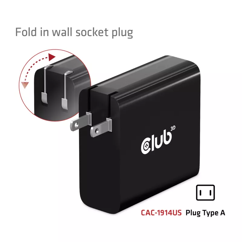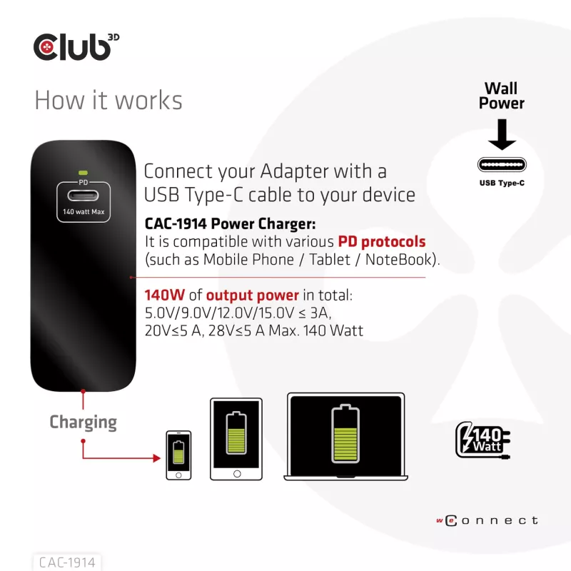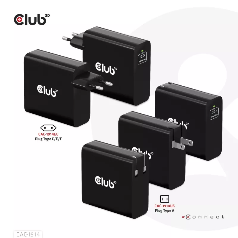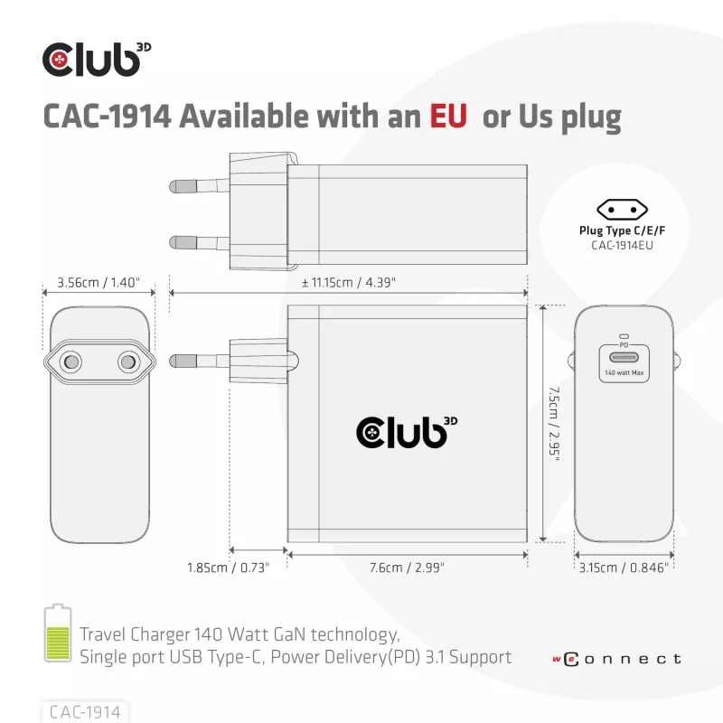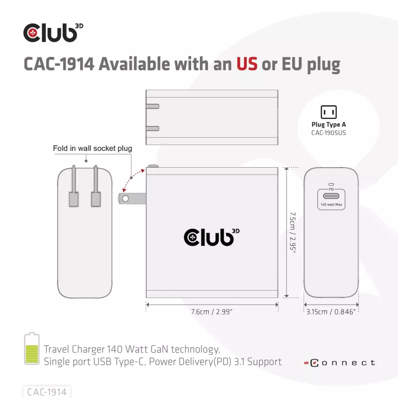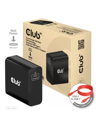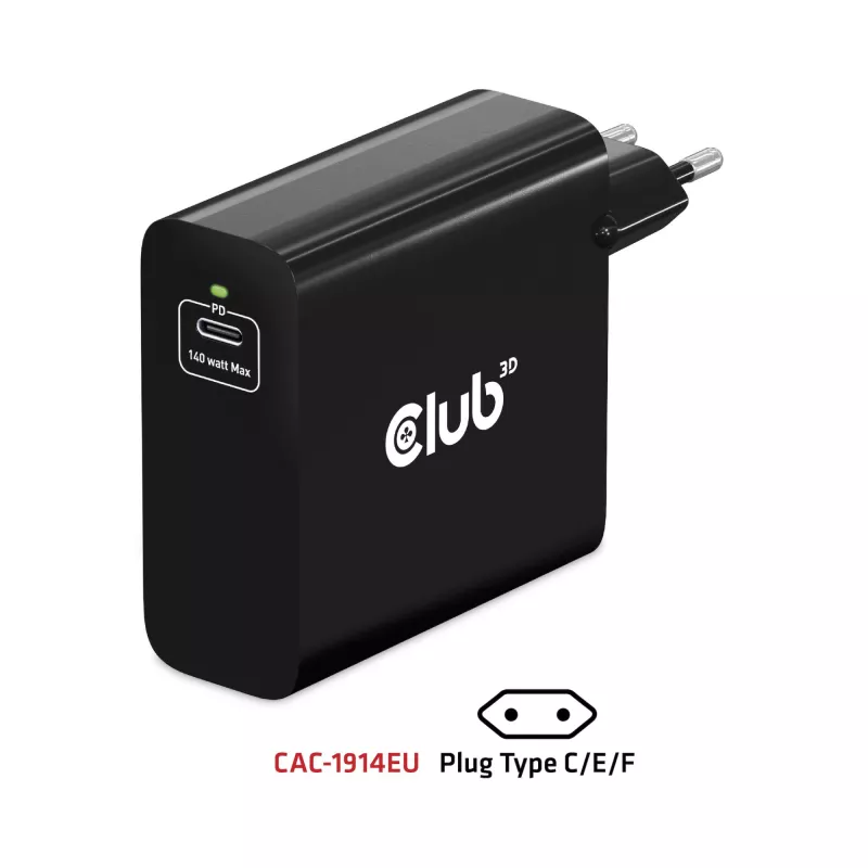 - CLUB3D TRAVEL CHARGER 140 WATT GAN TECHNOLOGY, SINGLE PORT USB TYPE-C, POWER DELIVERY(PD) 3.1 SUPPORT. CHARGER TYPE: INDOOR, POWER SOURCE TYPE: AC, USB, CHARGER COMPATIBILITY: BABY VIDEO MONITOR, BEARD TRIMMER, DIGITAL CAMCORDER, DIGITAL CAMERA, GAMING CO