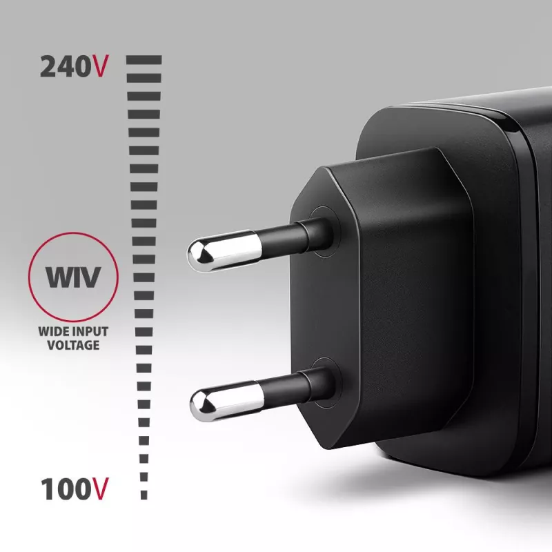- AXAGON ACU-PQ67 PD3.0 & QC4+ 2XOUTPUTS WALL CHARGER 67W. CHARGER TYPE: INDOOR, POWER SOURCE TYPE: AC, CHARGER COMPATIBILITY: UNIVERSAL. INPUT VOLTAGE: 100 - 240 V. USB 2.0 PORTS QUANTITY: 1, USB TYPE-C PORTS QUANTITY: 1, FAST CHARGING, POWER PROTECTION FE