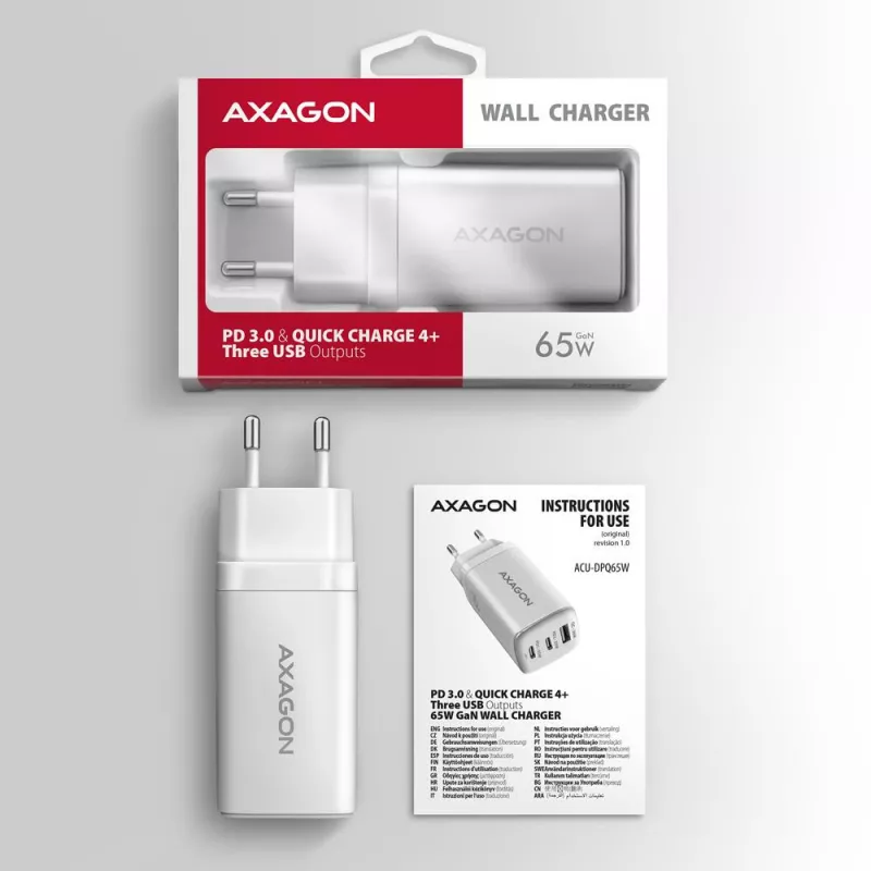 - AXAGON ACU-DPQ65W PD3.0 & QC4+ 3X OUTPUTS WALL CHARGER 65W. CHARGER TYPE: INDOOR, POWER SOURCE TYPE: AC, CHARGER COMPATIBILITY: MOBILE PHONE, NETBOOK, LAPTOP, SMARTPHONE, SMARTWATCH, TABLET, UNIVERSAL. INPUT VOLTAGE: 100 - 240 V, MAXIMUM OUTPUT VOLTAGE: 2