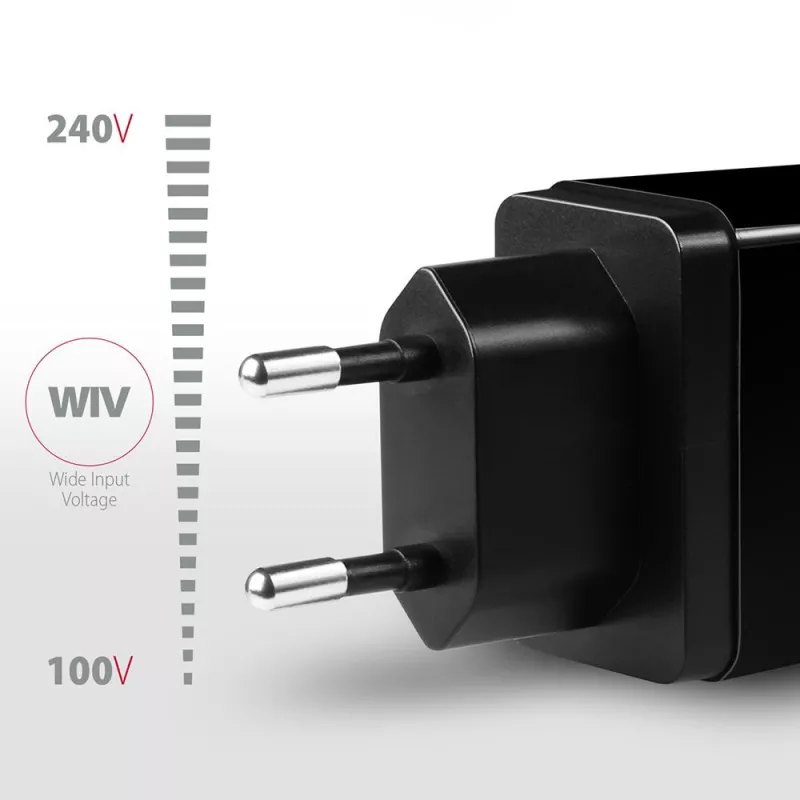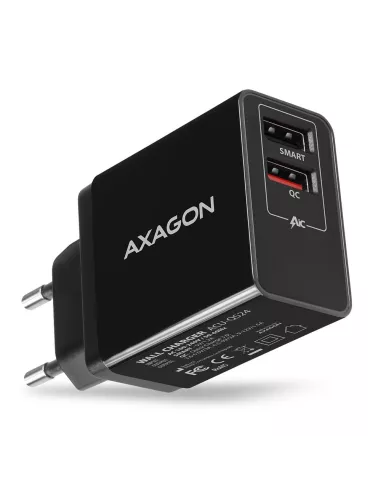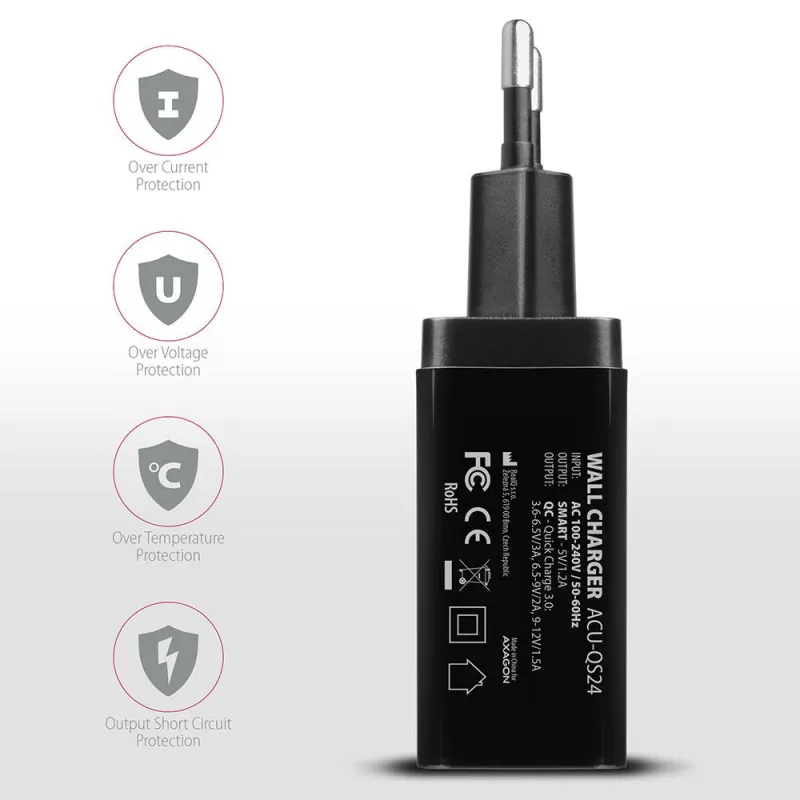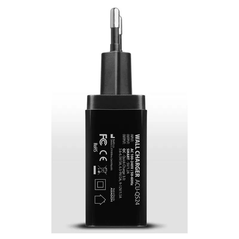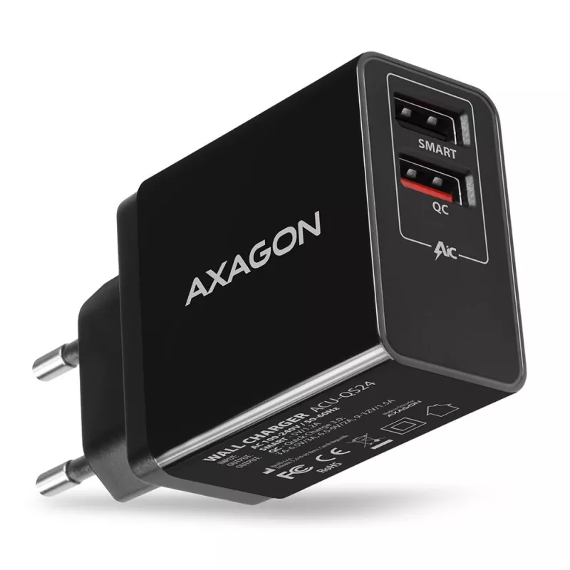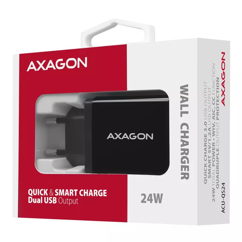 - AXAGON ACU-QS24 QUICK AND SMART WALL CHARGER, 2X USB PORT QC3.0/AFC/FCP + 5V-1.2A, 24W. CHARGER TYPE: INDOOR, POWER SOURCE TYPE: AC, CHARGER COMPATIBILITY: SMARTPHONE. INPUT VOLTAGE: 100 - 240 V, MAXIMUM OUTPUT VOLTAGE: 12 V. USB 2.0 PORTS QUANTITY: 2, FA