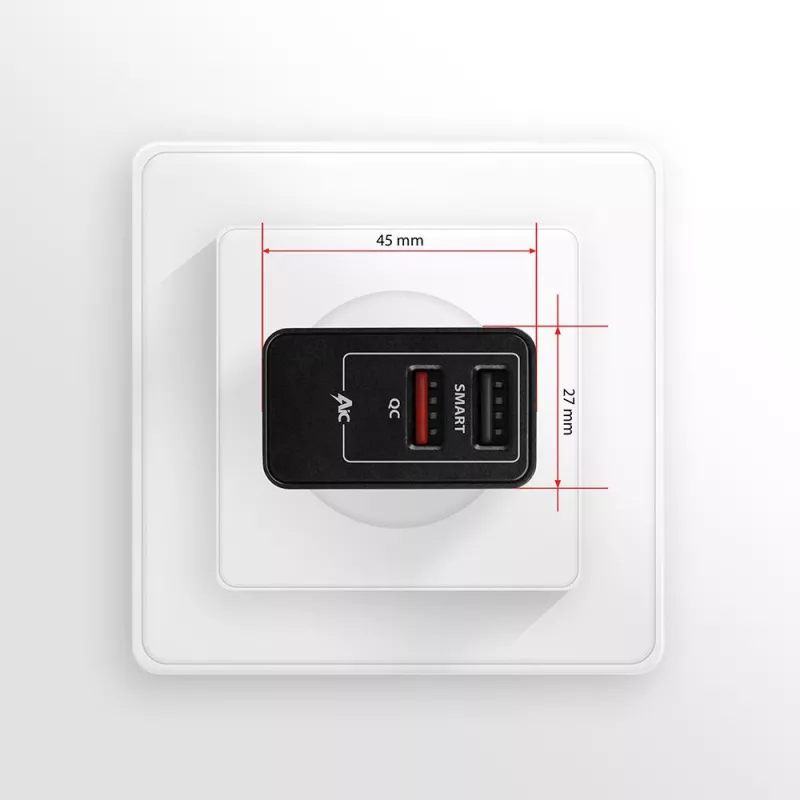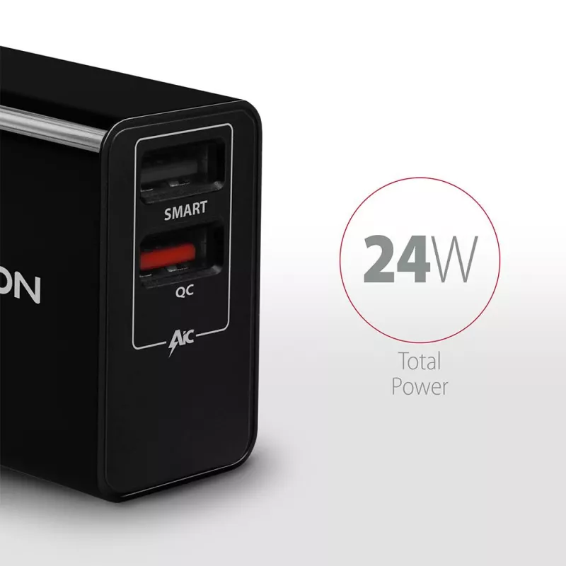 ACU-QS24 , Charger compatibility Smartphone , Power source type AC , 2xUSB 2.0 ports quantity , Fast charging Yes , Charger type Indoor , Product colour Black , Maximum power 24 W , Maximum output voltage 12 V , Weight 70 g