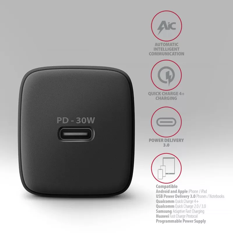 ACU-PD30 , Charger compatibility Universal/Smartphone/Tablet/Mobile phone/Smartwatch/Watch , Power source type AC , 1xUSB Type-C ports quantity , Fast charging Yes , Charger type Indoor , 1xNumber of simultaneously connected devices (max) , USB Power Delivery (USB PD) Yes , Product colour Black , Maximum power 30 W , Weight 56 g