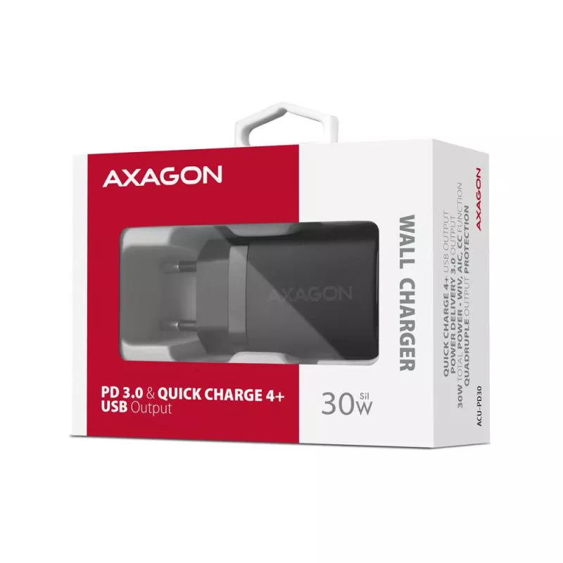 - AXAGON ACU-PD30 PD3.0 & QC4+ 1X OUTPUT WALL CHARGER 30W. CHARGER TYPE: INDOOR, POWER SOURCE TYPE: AC, CHARGER COMPATIBILITY: MOBILE PHONE, SMARTPHONE, SMARTWATCH, TABLET, UNIVERSAL, WATCH. INPUT VOLTAGE: 100 - 240 V. USB TYPE-C PORTS QUANTITY: 1, FAST CHA