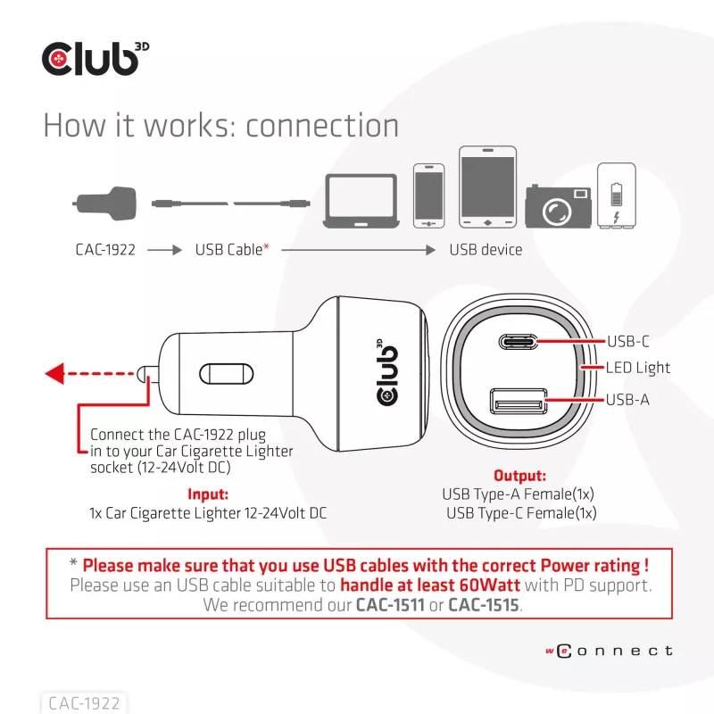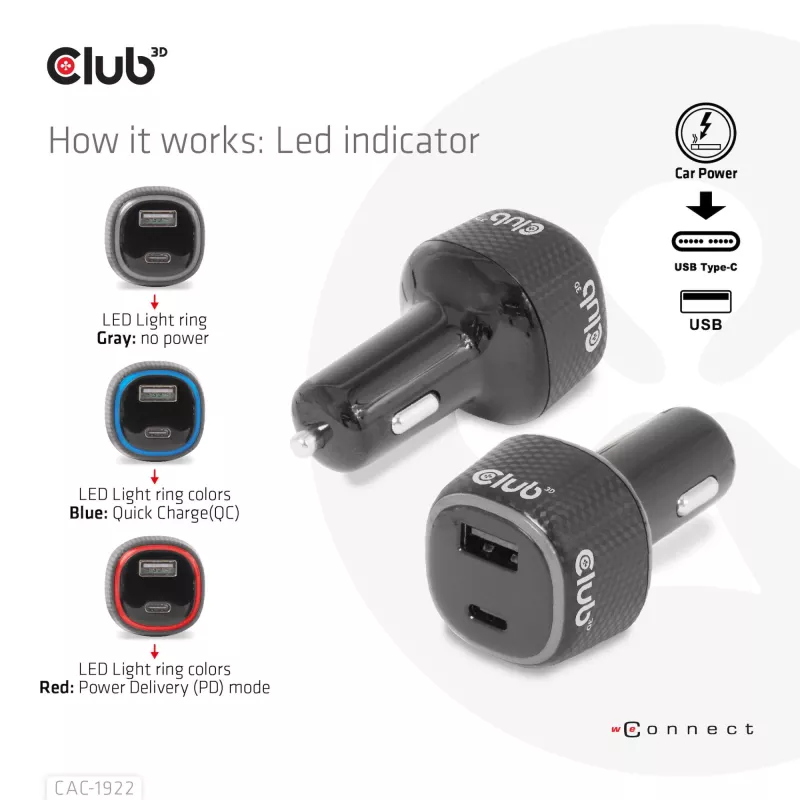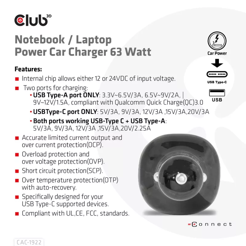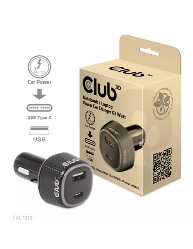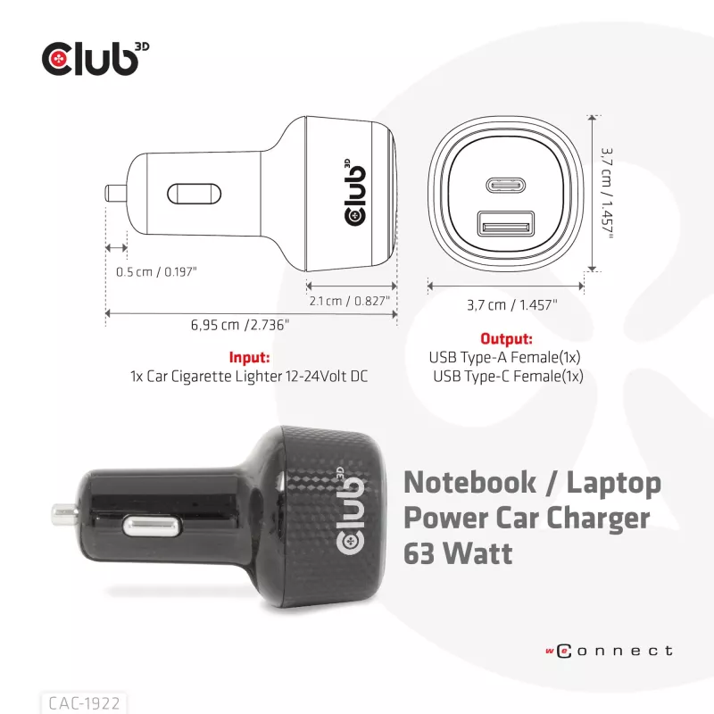 - CLUB3D NOTEBOOK / LAPTOP POWER CAR CHARGER 63 WATT. CHARGER TYPE: AUTO, POWER SOURCE TYPE: CIGAR LIGHTER, CHARGER COMPATIBILITY: LAPTOP. MAXIMUM OUTPUT VOLTAGE: 24 V. USB 2.0 PORTS QUANTITY: 1, USB TYPE-C PORTS QUANTITY: 1, POWER PROTECTION FEATURES: OVER