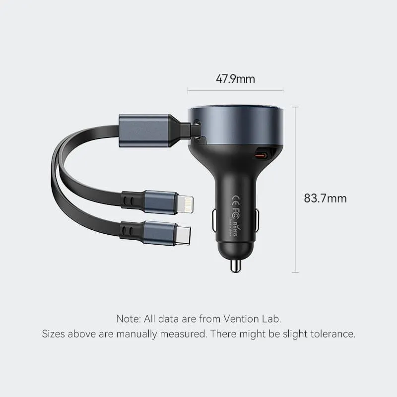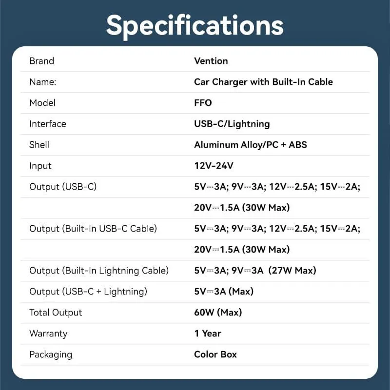 - VENTION FFOB0. CHARGER TYPE: AUTO, POWER SOURCE TYPE: CIGAR LIGHTER, CHARGER COMPATIBILITY: UNIVERSAL, USB TYPE-C PORTS QUANTITY: 1. PRODUCT COLOUR: BLACK, BLUE