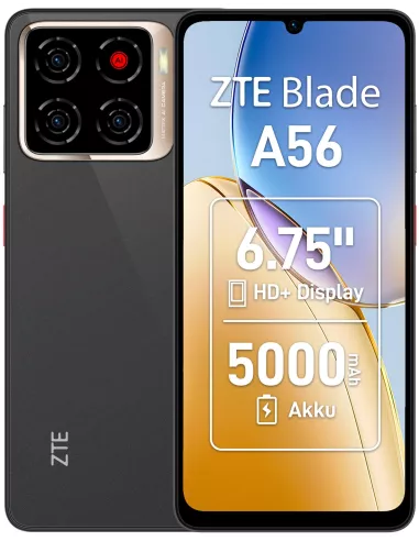 Model Blade A56 , Colour Black , Storage 128 GB , RAM 4 GB , Screen 6.75 " , Flat , 1600 x 720 pixels , CPU T7200 , Network 4G , SIM card NanoSIM , Wi-Fi Wi-Fi 4 (802.11n) , Bluetooth Yes , OS Android 15 , Battery capacity 5000 mAh , IP IP54 , USB-C charging power 10 W , Weight 193 g , Weight 0.193 kg