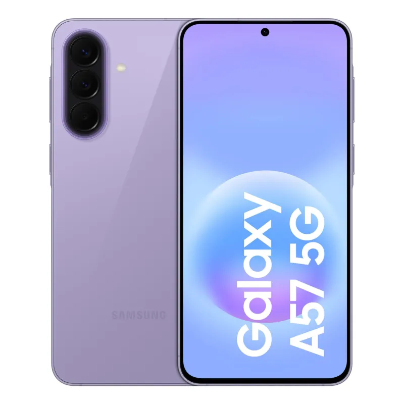 Model GALAXY A57 5G , Colour Lilac , Storage 128 GB , RAM 8 GB , Screen 6.7 " , Flat , Super AMOLED Plus , 1080 x 2340 pixels , Network 5G , SIM card NanoSIM + eSIM , Wi-Fi Wi-Fi 6E (802.11ax) , Bluetooth Yes , OS Android 16.0 , Battery capacity 5000 mAh , IP IP68 , USB-C charging power 45 W , Weight 179 g , Weight 0.179 kg