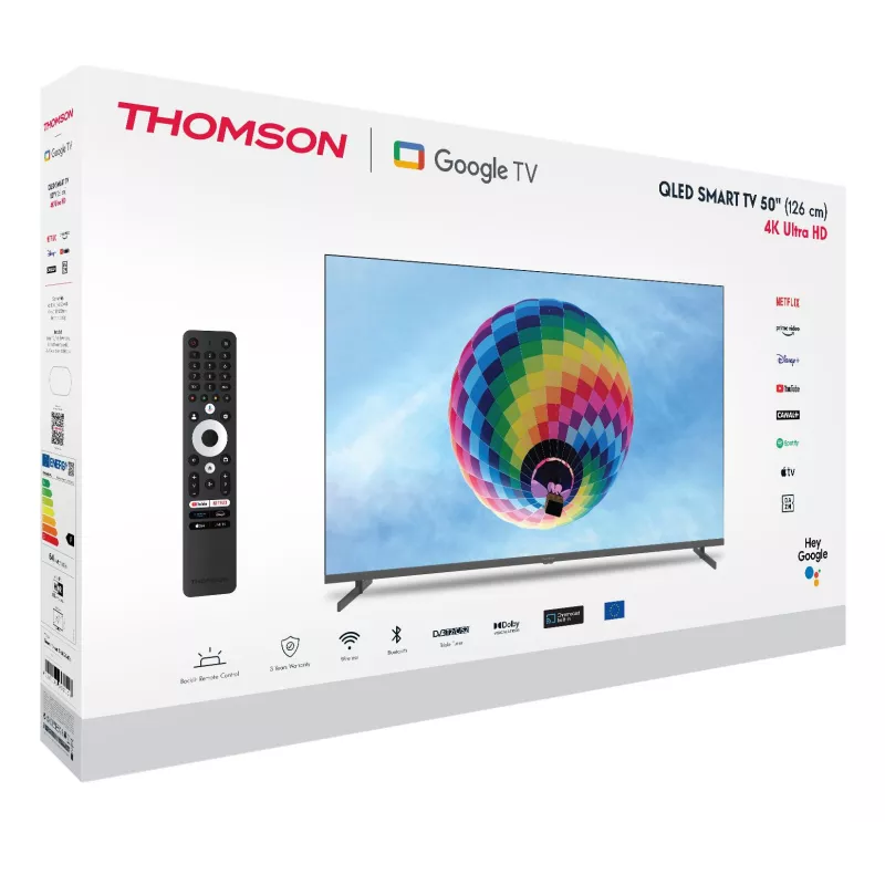 - THOMSON 50QG4S14. DISPLAY DIAGONAL: 139.7 CM (55"), DISPLAY RESOLUTION: 3840 X 2160 PIXELS, HD TYPE: 4K ULTRA HD, DISPLAY TECHNOLOGY: QLED, SCREEN SHAPE: FLAT. SMART TV. NATIVE ASPECT RATIO: 16:9. DIGITAL SIGNAL FORMAT SYSTEM: DVB-C, DVB-S, DVB-S2, DVB-T,