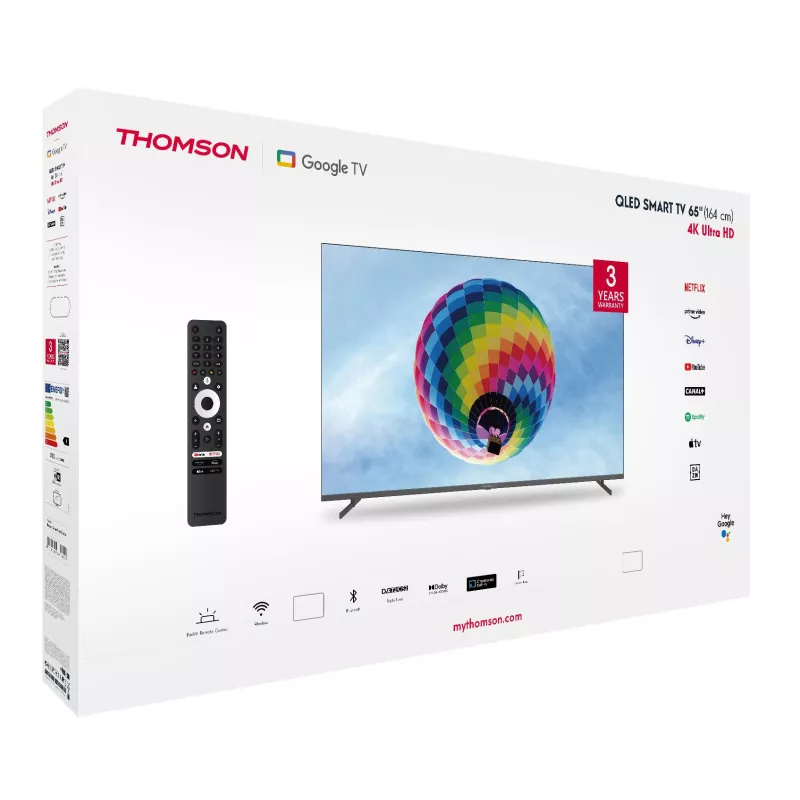 - THOMSON 65QG4S14. DISPLAY DIAGONAL: 165.1 CM (65"), DISPLAY RESOLUTION: 3840 X 2160 PIXELS, HD TYPE: 4K ULTRA HD, DISPLAY TECHNOLOGY: QLED, SCREEN SHAPE: FLAT. SMART TV. NATIVE ASPECT RATIO: 16:9. DIGITAL SIGNAL FORMAT SYSTEM: DVB-C, DVB-S, DVB-S2, DVB-T,