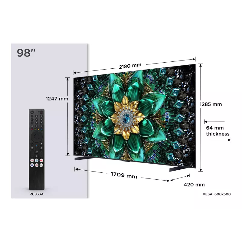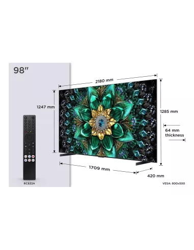 - TCL Q6C 98Q6C. DISPLAY DIAGONAL: 2.49 M (98"), DISPLAY RESOLUTION: 3840 X 2160 PIXELS, HD TYPE: 4K ULTRA HD, DISPLAY TECHNOLOGY: QD-MINI LED, SCREEN SHAPE: FLAT. SMART TV. MOTION INTERPOLATION TECHNOLOGY: PPI (PICTURE PERFORMANCE INDEX) 4100, NATIVE ASPEC