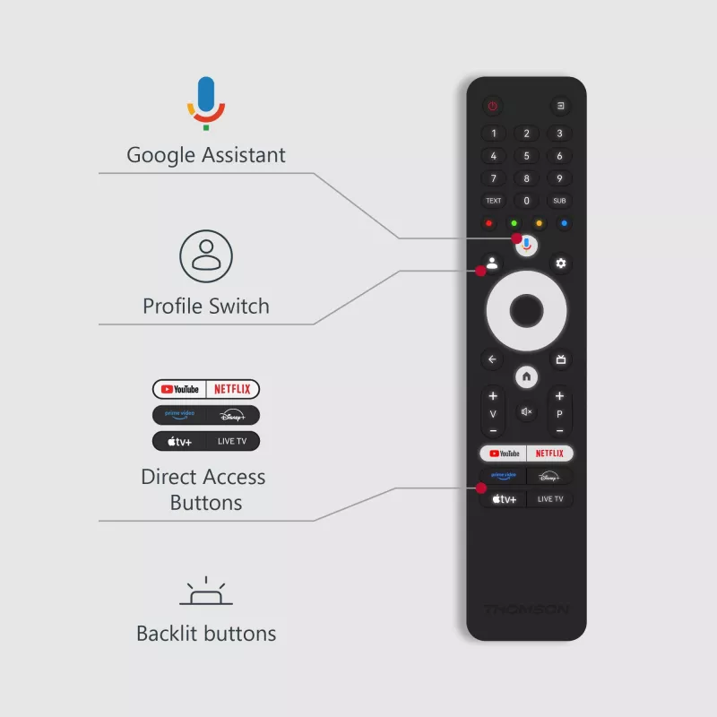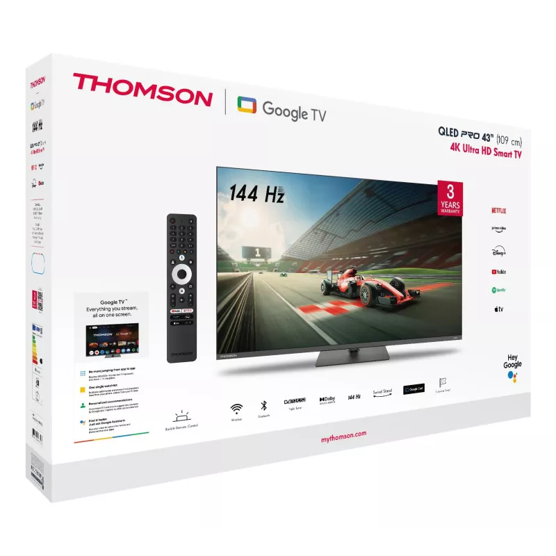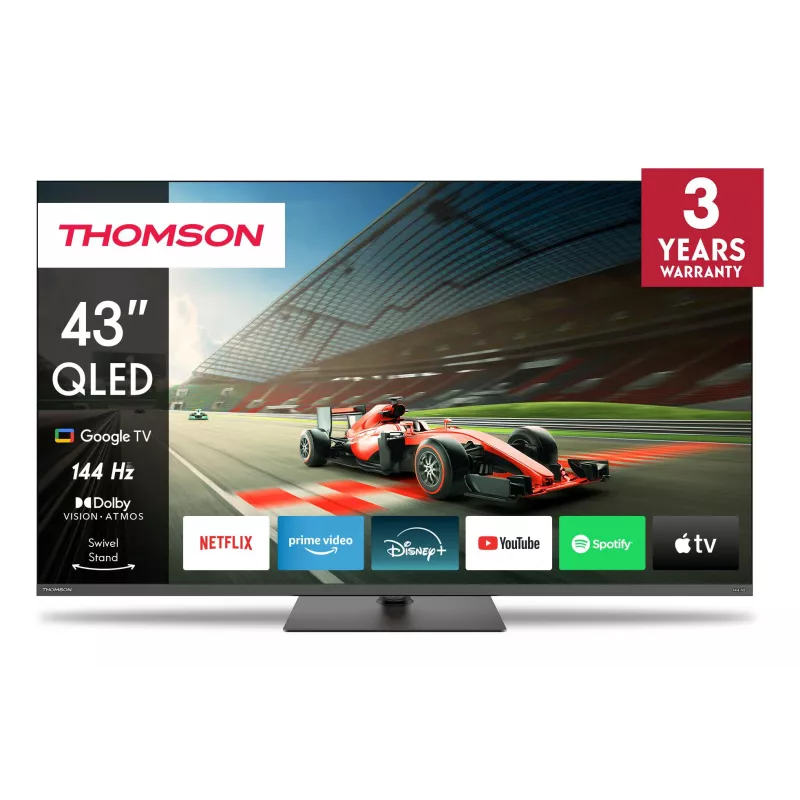 - THOMSON 43QG7C04. DISPLAY DIAGONAL: 109.2 CM (43"), DISPLAY RESOLUTION: 3840 X 2160 PIXELS, HD TYPE: 4K ULTRA HD, DISPLAY TECHNOLOGY: QLED PRO, SCREEN SHAPE: FLAT. SMART TV. CONTRAST RATIO (TYPICAL): 4000:1, NATIVE ASPECT RATIO: 16:9. DIGITAL SIGNAL FORMA
