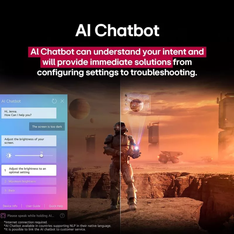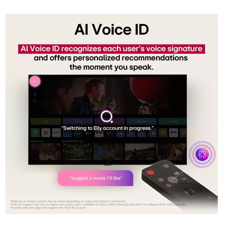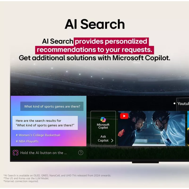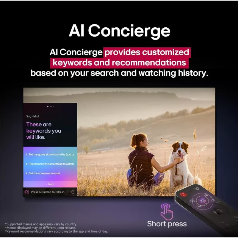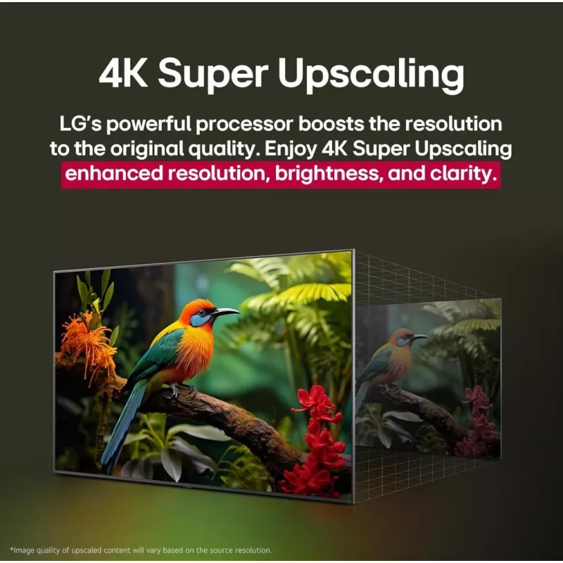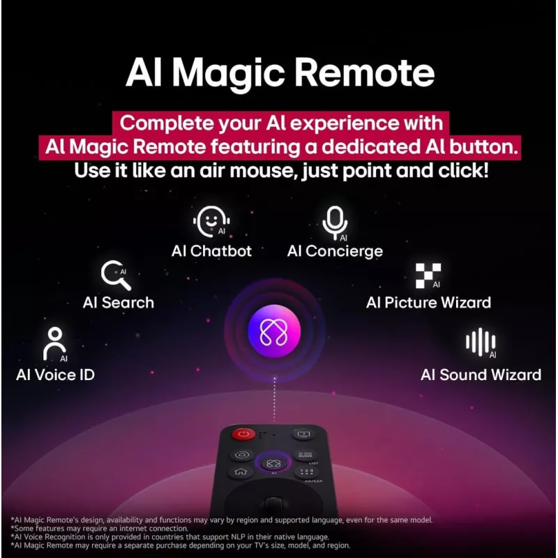 - AI ROOM CALIBRATION/AI SUPER UPSCALING 4K/BLUETOOTH SURROUND READY/LG CHANNELS/LG SOUND SYNC/MAGIC REMOTE CONTROL/THINQT/WORKS WITH APPLE HOMEKIT/WOW ORCHESTRA
