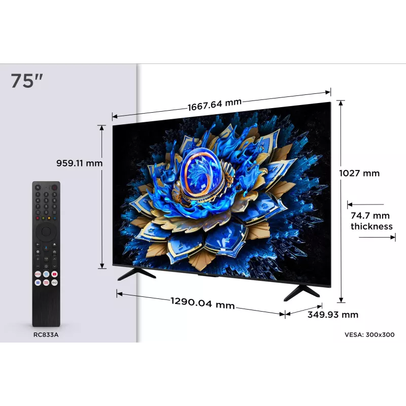 - TCL T69C 75T69C. DISPLAY DIAGONAL: 190.5 CM (75"), DISPLAY RESOLUTION: 3840 X 2160 PIXELS, HD TYPE: 4K ULTRA HD, DISPLAY TECHNOLOGY: LCD, SCREEN SHAPE: FLAT, LED BACKLIGHTING TYPE: DIRECT-LED. SMART TV. MOTION INTERPOLATION TECHNOLOGY: PPI (PICTURE PERFOR
