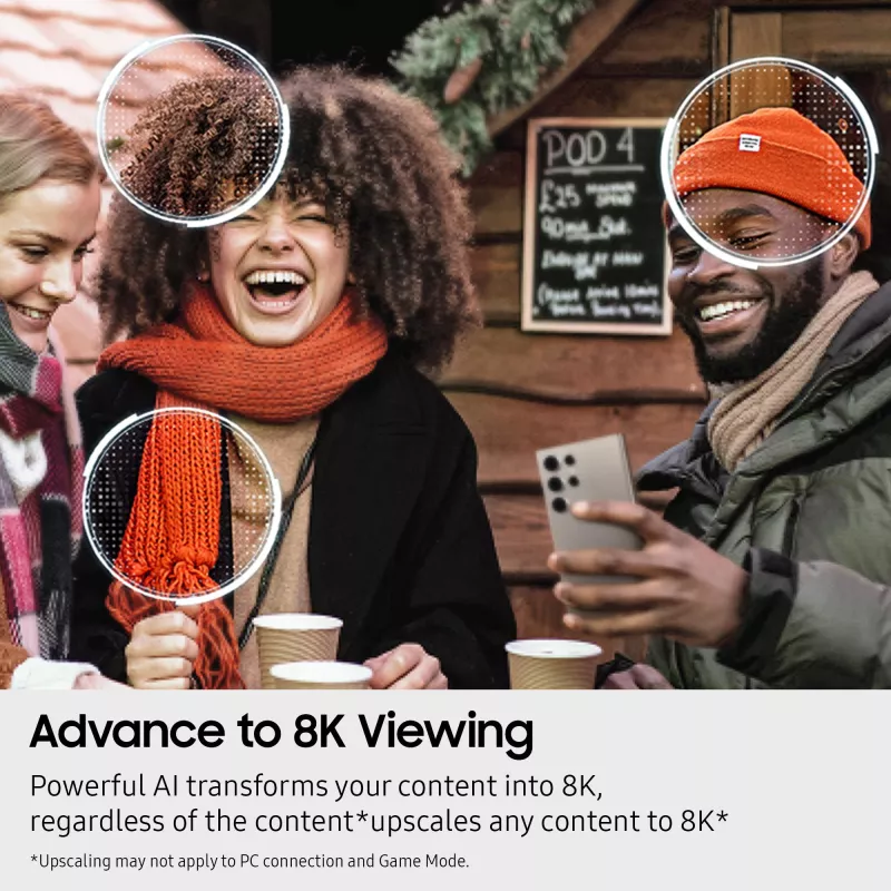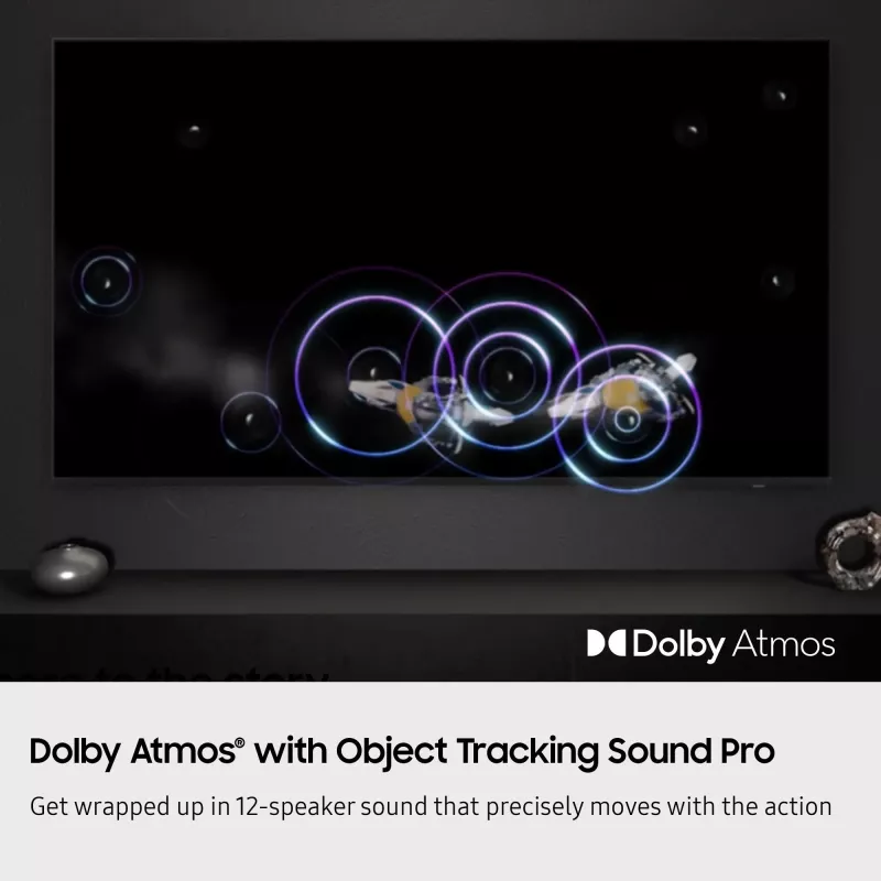 - NQ8 AI GEN2 PROCESSOR, 8K AI UPSCALING, GLARE FREE, NEO QUANTUM HDR 8K PRO*, QUANTUM MATRIX TECHNOLOGY PRO, DOLBY ATMOS , METAL FRAME DESIGN, AI MOTION ENHANCER, OBJECT TRACKING SOUND+, MOTION XCELERATOR 165HZ, PANTONE VALIDATED, SAMSUNG Q-SYMPHONY, SMART