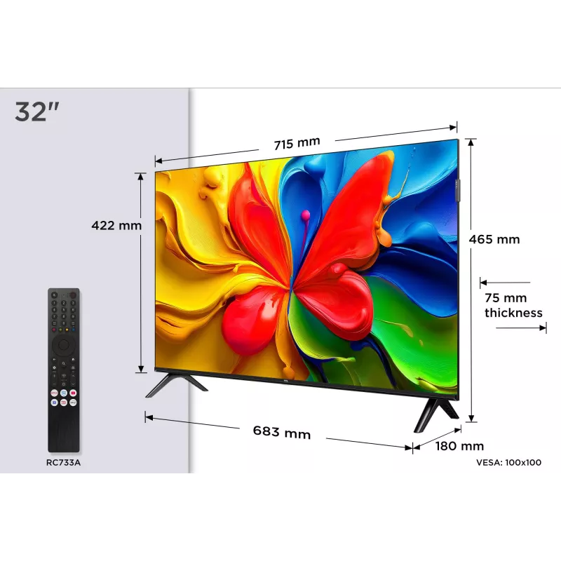 - TCL 32V4C. DISPLAY DIAGONAL: 81.3 CM (32"), DISPLAY RESOLUTION: 1366 X 768 PIXELS, HD TYPE: HD, DISPLAY TECHNOLOGY: QLED, SCREEN SHAPE: FLAT, LED BACKLIGHTING TYPE: DIRECT-LED. SMART TV. MOTION INTERPOLATION TECHNOLOGY: PPI (PICTURE PERFORMANCE INDEX) 600