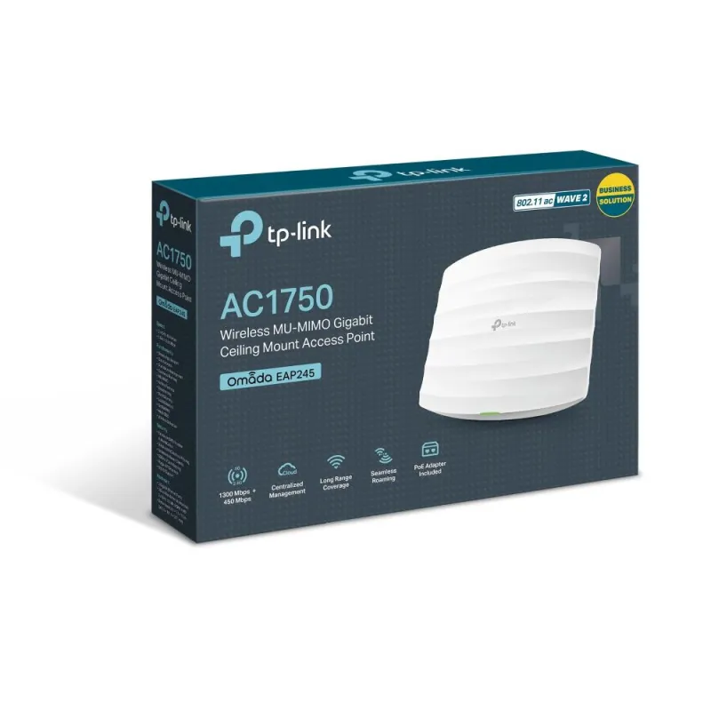 Omada , EAP245 , Frequency band 2.4 - 5 GHz , Cabling technology 10/100/1000Base-T(X) , Security algorithms 128-bit WEP/64-bit WEP/WPA-PSK/WPA2-PSK/152-bit WEP/WPA/WPA2 , 2xEthernet LAN (RJ-45) ports , Power over Ethernet (PoE) Yes , Power consumption (typical) 12.7 W , Placement Ceiling,Wall , Colour White , Antenna type Internal , Operating temperature (T-T) 0 - 40 °C