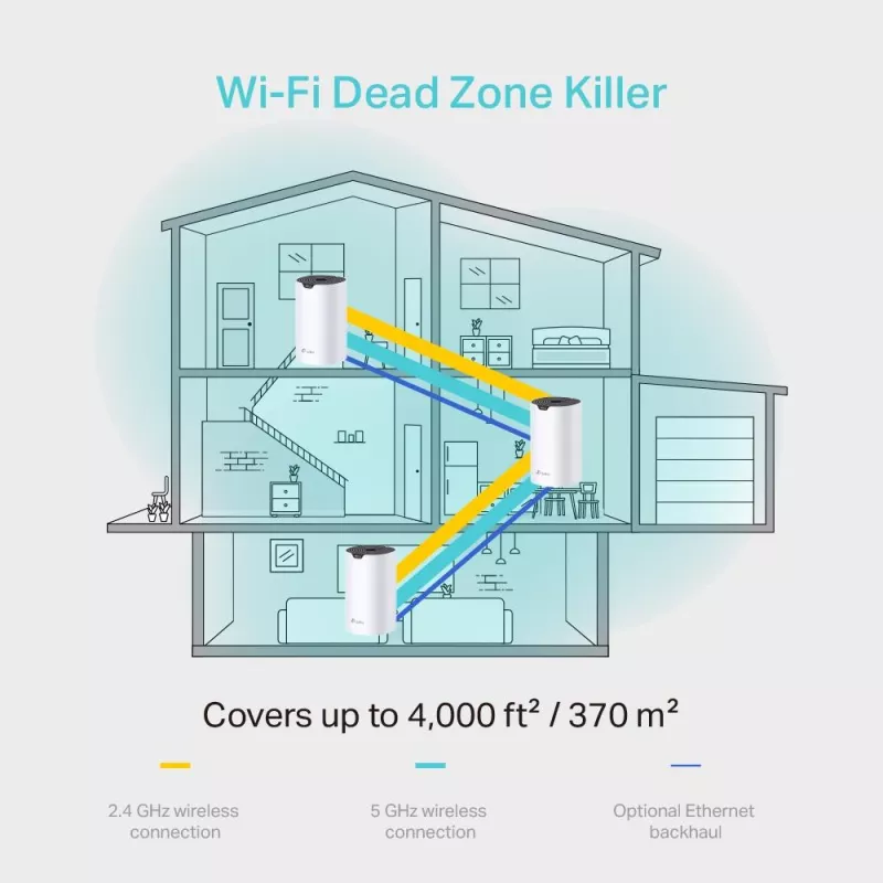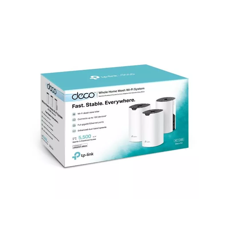 3-pack , Available bandwidth 1167 Mbps , Data transmission speed 867 Mbps , Mesh , Antenna Type Built-in , Number of antennas 2 , Wireless Frequency Range 2.4 GHz and 5 GHz , Wireless Transmit Power 30 dBm , Included Accessories 3 Deco S4R Units1 RJ45 Ethernet Cable3 Power Adapters1 Quick Installation Guide , Dimensions 90.7 × 90.7 × 162.3 mm