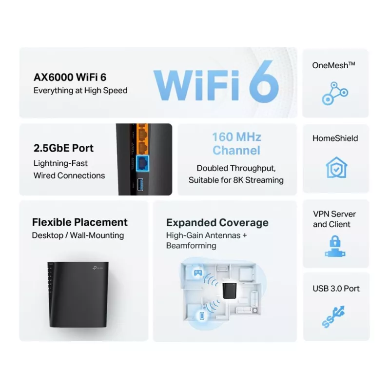Wireless Router, TP-LINK, Wireless Router, 6000 Mbps, Wi-Fi 6, USB 3.0, 3x10/100/1000M, LAN WAN ports 2, ARCHERAX80