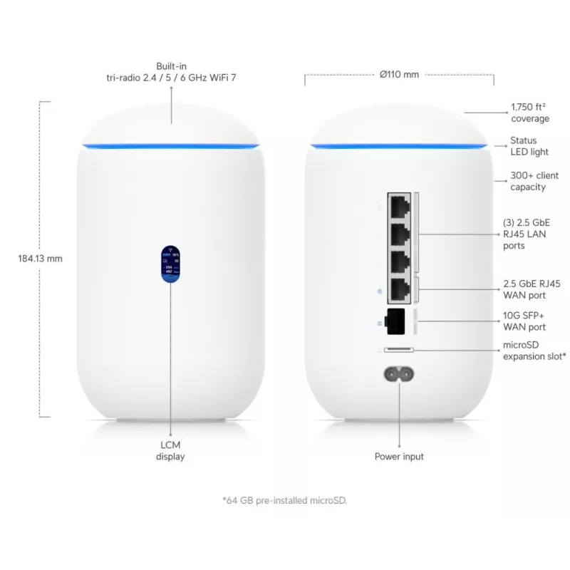 Wireless Router, UBIQUITI, Dream 7, Wi-Fi 7 (802.11be), Data speed 5700 Mbit/s, Ethernet WAN Yes, Ethernet LAN Yes, 4xLAN ports