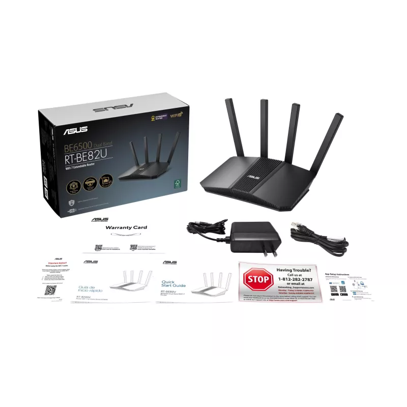 - ASUS RT-BE82U BE6500. WAN CONNECTION TYPE: RJ-45. WI-FI BAND: DUAL-BAND (2.4 GHZ / 5 GHZ), TOP WI-FI STANDARD: WI-FI 7 (802.11BE), WLAN DATA TRANSFER RATE (MAX): 6500 MBIT/S. ETHERNET LAN INTERFACE TYPE: 2.5 GIGABIT ETHERNET, ETHERNET LAN DATA RATES: 10,1