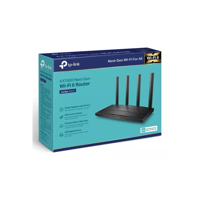 Archer AX17 , Dual-band (2.4 GHz / 5 GHz) , Wi-Fi 6 (802.11ax) , WLAN data transfer rate (max) 1501 Mbit/s , Ethernet WAN Yes , Ethernet LAN Yes , Ethernet LAN interface type Gigabit Ethernet , 4xEthernet LAN (RJ-45) ports , AC adapter included Yes , Antenna design External , Power source type DC , Operating temperature (T-T) 0 - 40 °C