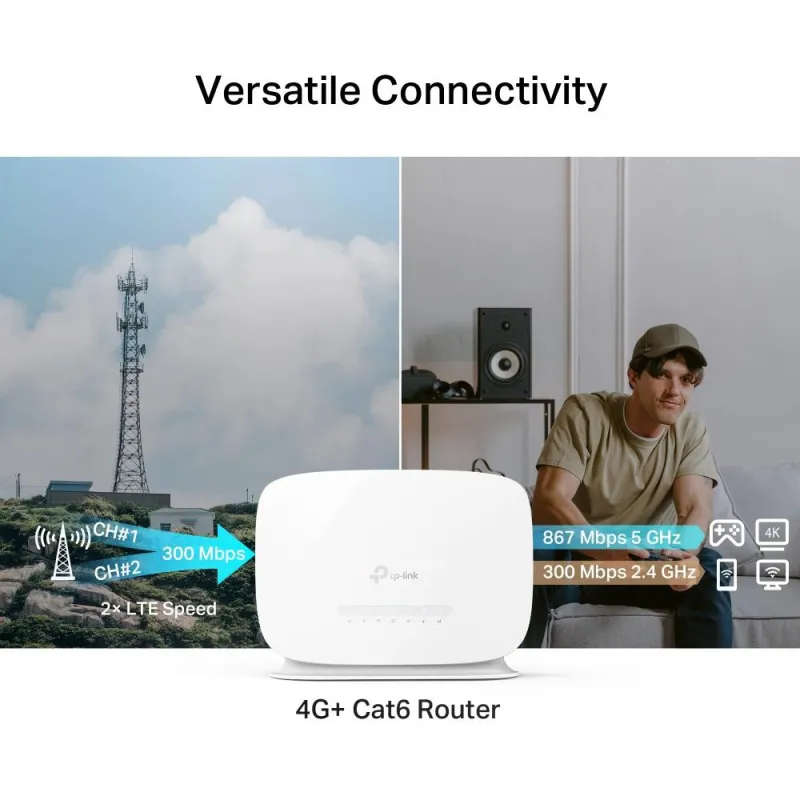 - TP-LINK ARCHER 4G+ CAT6 AC1200 WIRELESS DUAL BAND GIGABIT ROUTER. WI-FI BAND: DUAL-BAND (2.4 GHZ / 5 GHZ), TOP WI-FI STANDARD: WI-FI 5 (802.11AC), WLAN DATA TRANSFER RATE (MAX): 1200 MBIT/S. ETHERNET LAN INTERFACE TYPE: GIGABIT ETHERNET, ETHERNET LAN DATA