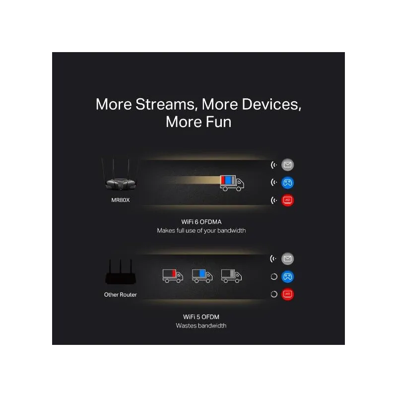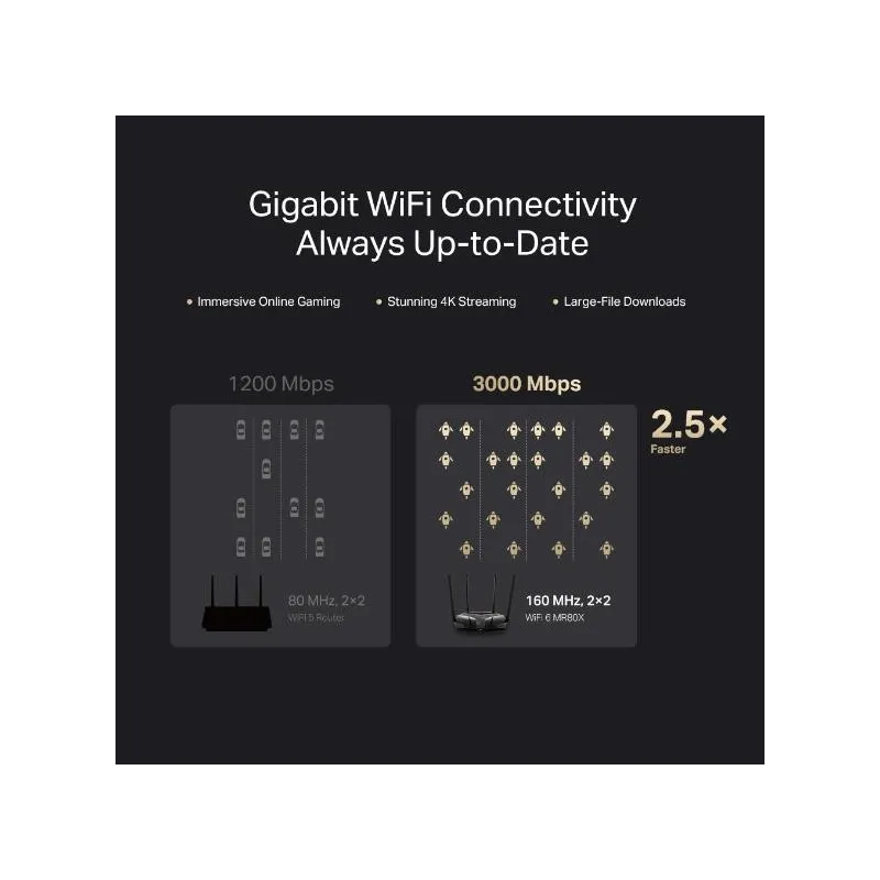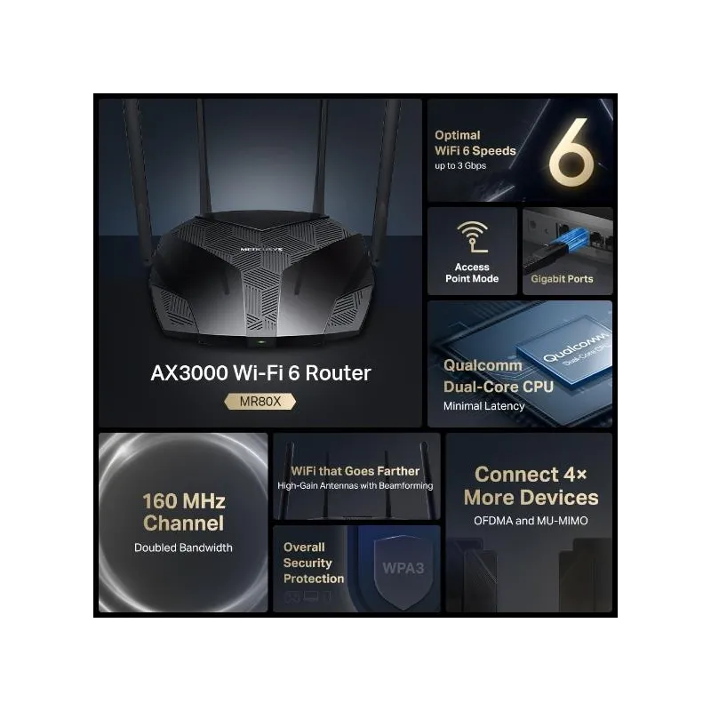 Dual-band (2.4 GHz / 5 GHz) , Wi-Fi 6 (802.11ax) , WLAN data transfer rate (max) 3000 Mbit/s , Ethernet WAN Yes , Ethernet LAN Yes , Ethernet LAN interface type Gigabit Ethernet , 3xEthernet LAN (RJ-45) ports , AC adapter included Yes , Antenna design External , Power source type AC , Operating temperature (T-T) 0 - 40 °C