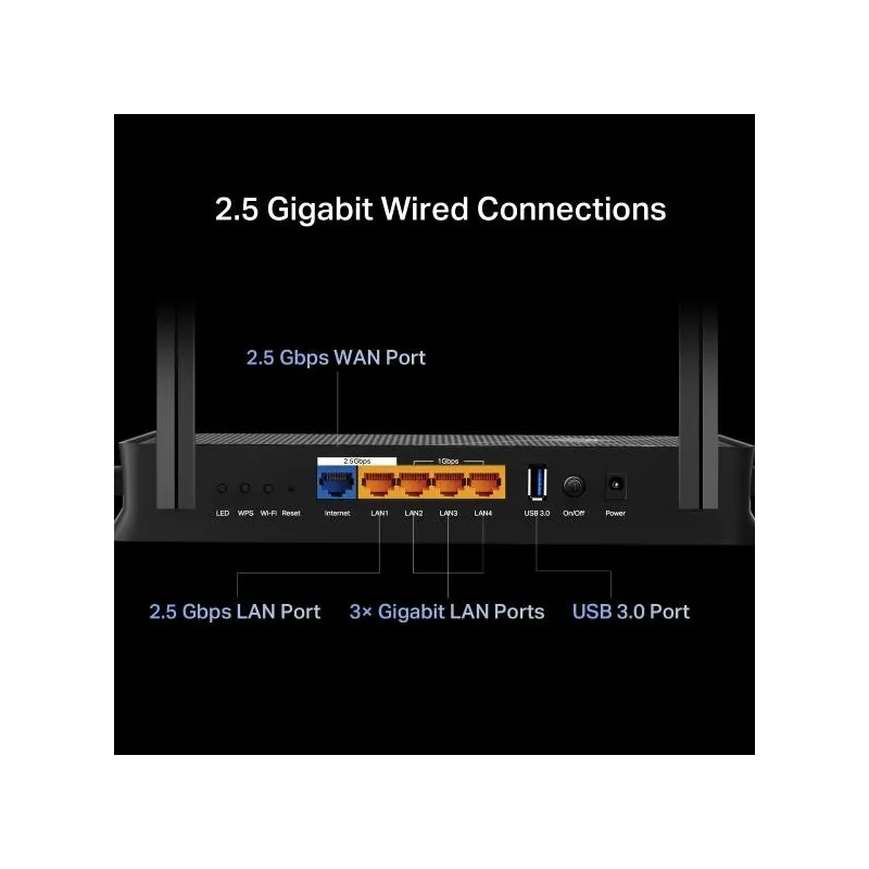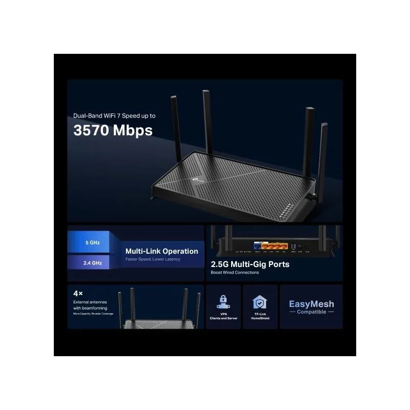 ARCHER BE3600 , Dual-band (2.4 GHz / 5 GHz) , Wi-Fi 7 (802.11be) , WLAN data transfer rate (max) 2882 Mbit/s , Ethernet WAN Yes , Ethernet LAN Yes , Ethernet LAN interface type 2.5 Gigabit Ethernet , 5xEthernet LAN (RJ-45) ports , Antenna design External , Power source type AC , Operating temperature (T-T) 0 - 40 °C