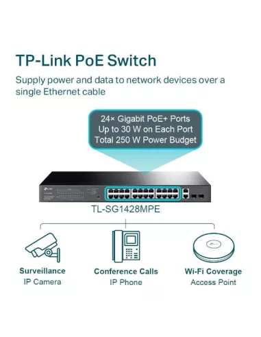 PoE+ ports 24 , PoE power budget 250 Watts , Switching capacity 56 Gbps , Forwarding rate 41.7 Mpps , Switching method Store-and-forward , Power supply External , Included Accessories TL-SG1428PE, Power cord, User manual, Rack mounting kit, Rubber feet , Dimensions 440 × 220 × 44 mm , Product Net Weight 3.4 kg
