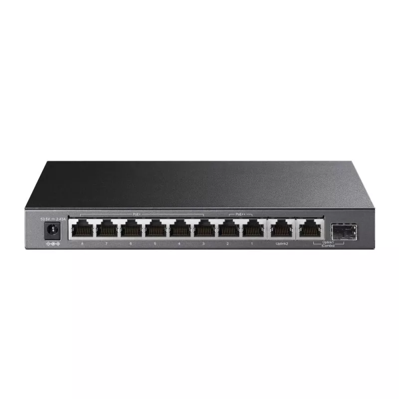 TL-SG1210PP , Type Unmanaged , Quality of Service (QoS) support Yes , 10xBasic switching RJ-45 Ethernet ports quantity , Basic switching RJ-45 Ethernet ports type Gigabit Ethernet (10/100/1000) , 1xCombo SFP ports quantity , Switching capacity 20 Gbit/s , Forwarding rate 14.88 Mpps , Product colour Black , Power source DC/PoE , Power supply included Yes , 1xNumber of power supply units , Power over Ethernet (PoE) Yes , 2xPower over Ethernet plus (PoE+) ports quantity , 6xPower over Ethernet 4PPoE (PoE++) ports quantity , Total Power over Ethernet (PoE) budget 123 W , Width 209 mm , Depth 126 mm , Height 26 mm