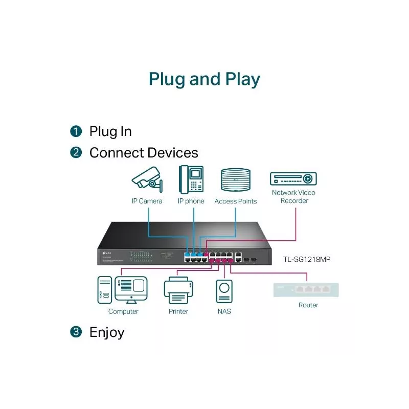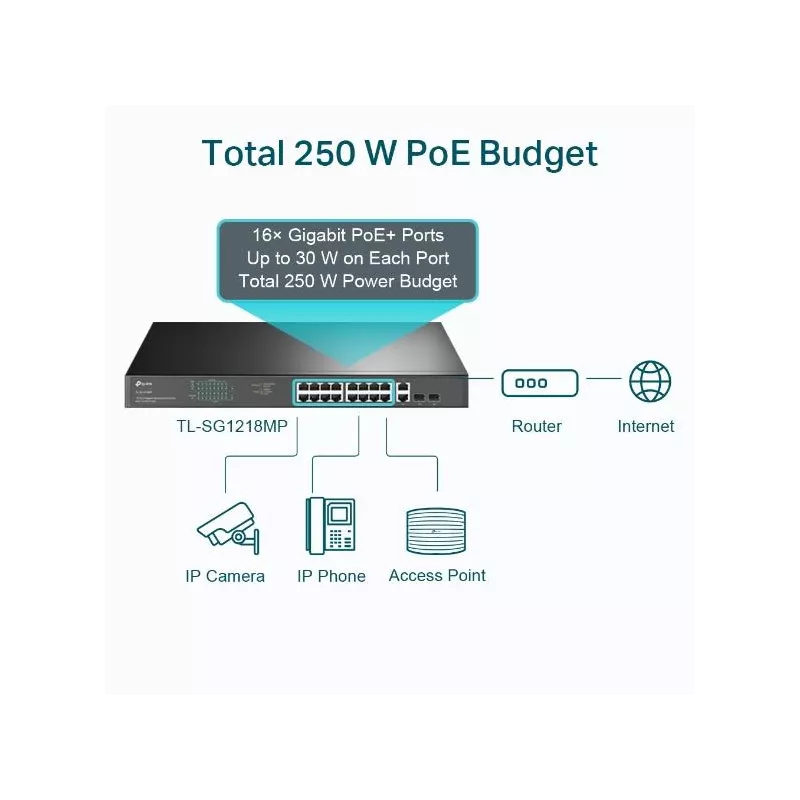 TL-SG1218MP , Type Unmanaged , Quality of Service (QoS) support Yes , 18xBasic switching RJ-45 Ethernet ports quantity , Basic switching RJ-45 Ethernet ports type Gigabit Ethernet (10/100/1000) , 2xCombo SFP ports quantity , Half duplex Yes , Full duplex Yes , Switching capacity 36 Gbit/s , Forwarding rate 26.78 Mpps , Rack mounting Yes , Form factor 1U , Product colour Black , Power source AC , Power supply included Yes , Power over Ethernet (PoE) Yes , 16xPower over Ethernet plus (PoE+) ports quantity , Power over Ethernet (PoE) power per port 30 W , Total Power over Ethernet (PoE) budget 250 W , Width 440 mm , Depth 180 mm , Height 44 mm