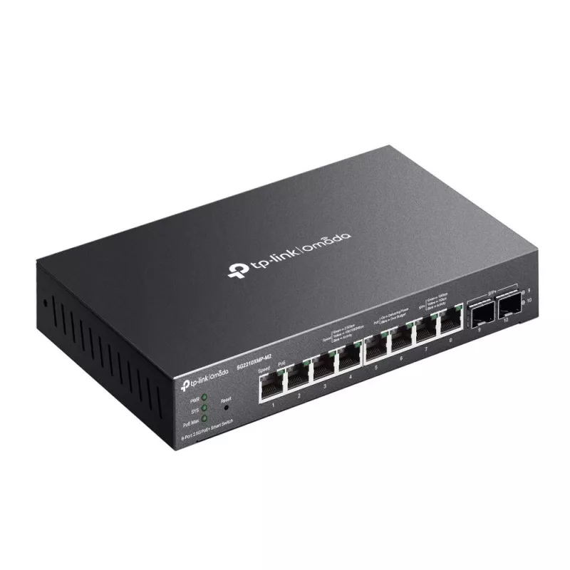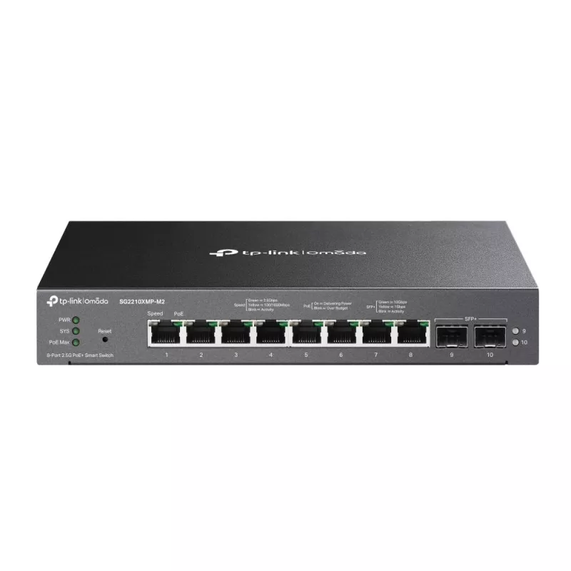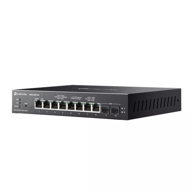 - TP-LINK OMADA 8-PORT 2.5GBASE-T AND 2-PORT 10GE SFP+ SMART SWITCH WITH 8-PORT POE+. SWITCH TYPE: MANAGED, SWITCH LAYER: L2/L2+. BASIC SWITCHING RJ-45 ETHERNET PORTS TYPE: 2.5G ETHERNET (100/1000/2500), BASIC SWITCHING RJ-45 ETHERNET PORTS QUANTITY: 8. MAC