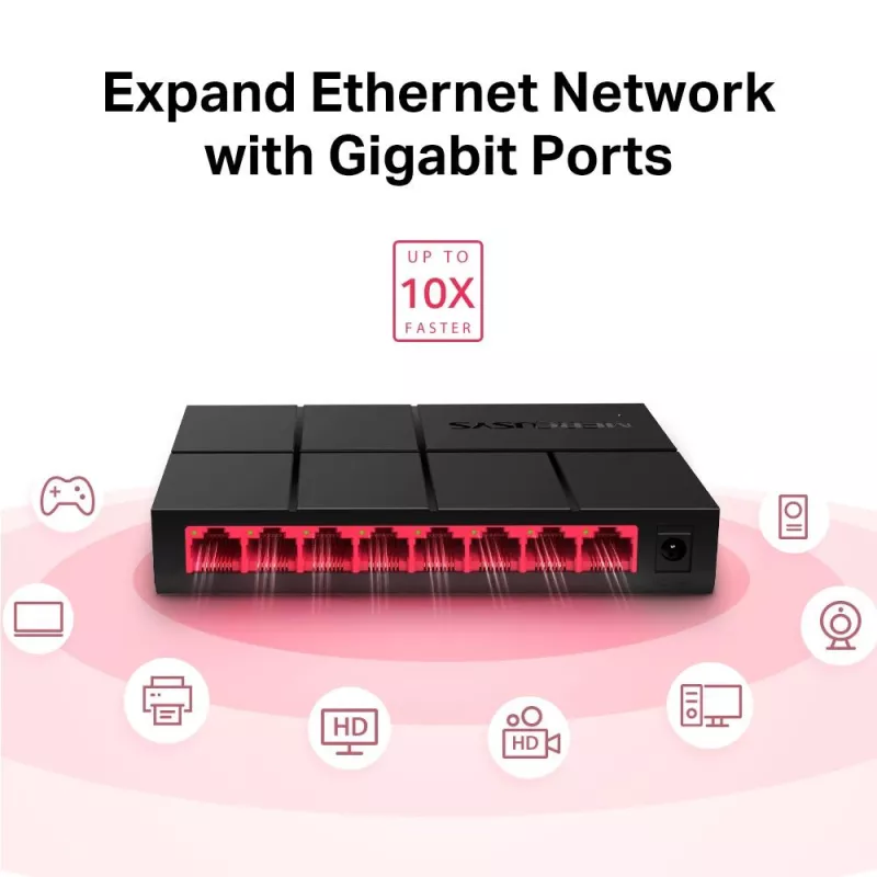 MS108G , Type Unmanaged , 8xBasic switching RJ-45 Ethernet ports quantity , Basic switching RJ-45 Ethernet ports type Gigabit Ethernet (10/100/1000) , Full duplex Yes , Half duplex Yes , Product colour Black , Power source DC , Power supply included Yes , Width 144.8 mm , Depth 72.3 mm , Height 25 mm