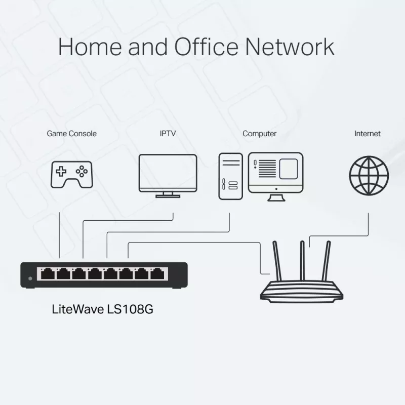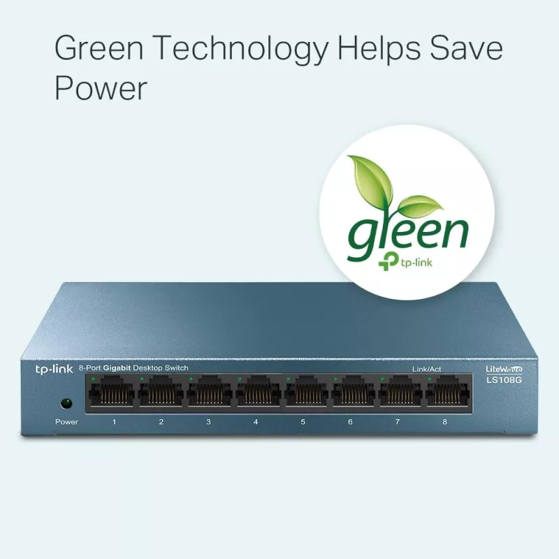 Series TP-LINK LS108G , LS108G , Type Unmanaged , Quality of Service (QoS) support Yes , 8xBasic switching RJ-45 Ethernet ports quantity , Basic switching RJ-45 Ethernet ports type Gigabit Ethernet (10/100/1000) , Switching capacity 16 Gbit/s , Forwarding rate 11.9 Mpps , Product colour Blue , Power source DC , Power supply included Yes , Width 158 mm , Depth 99 mm , Height 25 mm