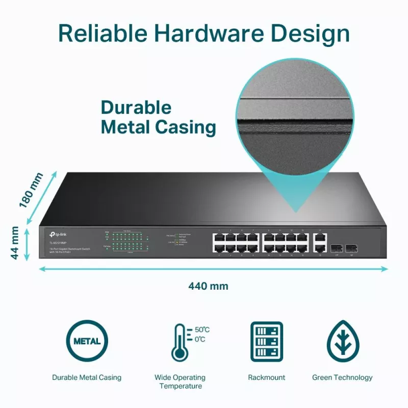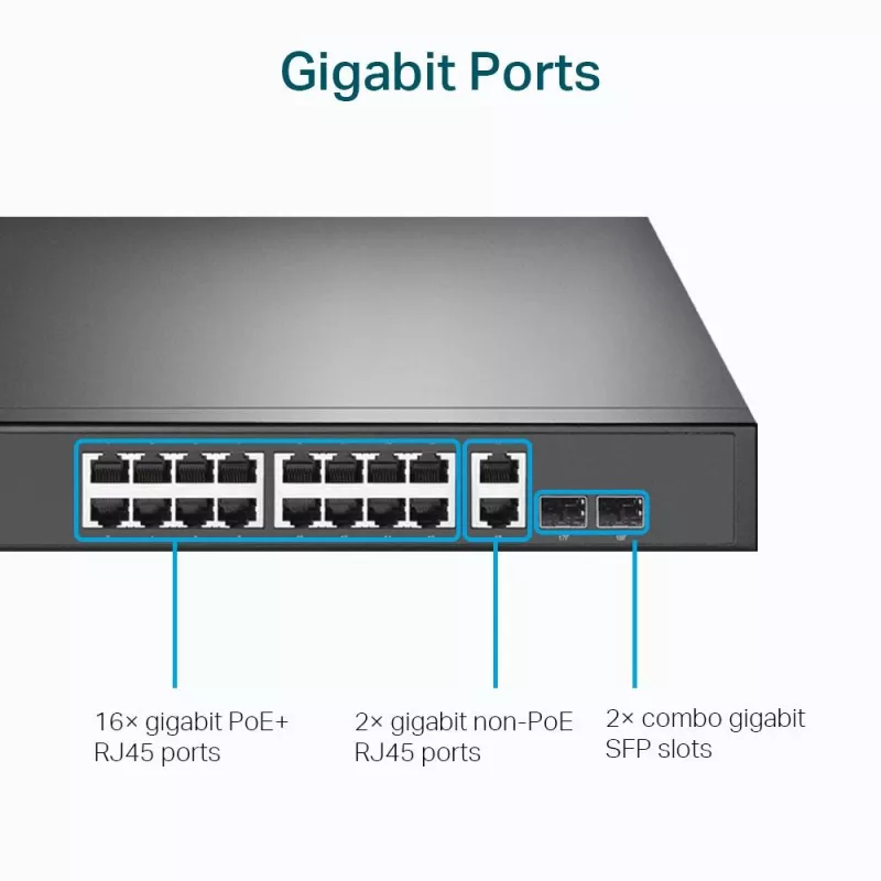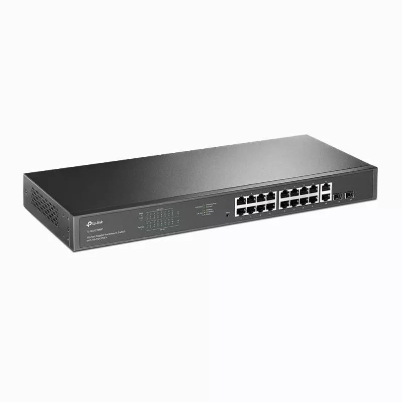 - TP-LINK 18-PORT GIGABIT RACKMOUNT SWITCH WITH 16 POE+. SWITCH TYPE: UNMANAGED. BASIC SWITCHING RJ-45 ETHERNET PORTS TYPE: GIGABIT ETHERNET (10/100/1000), BASIC SWITCHING RJ-45 ETHERNET PORTS QUANTITY: 18. FULL DUPLEX. MAC ADDRESS TABLE: 8000 ENTRIES, SWIT