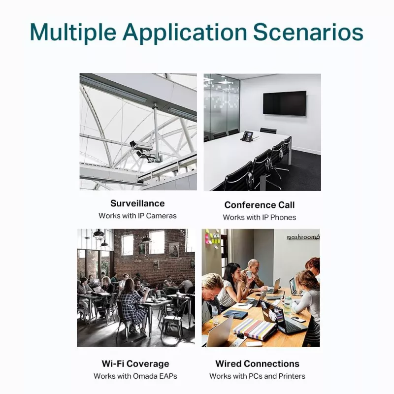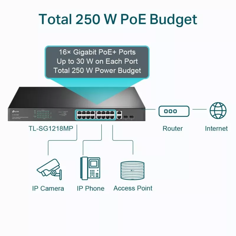 TL-SG1218MP , Type Unmanaged , Quality of Service (QoS) support Yes , 18xBasic switching RJ-45 Ethernet ports quantity , Basic switching RJ-45 Ethernet ports type Gigabit Ethernet (10/100/1000) , 2xCombo SFP ports quantity , Half duplex Yes , Full duplex Yes , Switching capacity 36 Gbit/s , Forwarding rate 26.78 Mpps , Rack mounting Yes , Form factor 1U , Product colour Black , Power source AC , Power supply included Yes , Power over Ethernet (PoE) Yes , 16xPower over Ethernet plus (PoE+) ports quantity , Power over Ethernet (PoE) power per port 30 W , Total Power over Ethernet (PoE) budget 250 W , Width 440 mm , Depth 180 mm , Height 44 mm