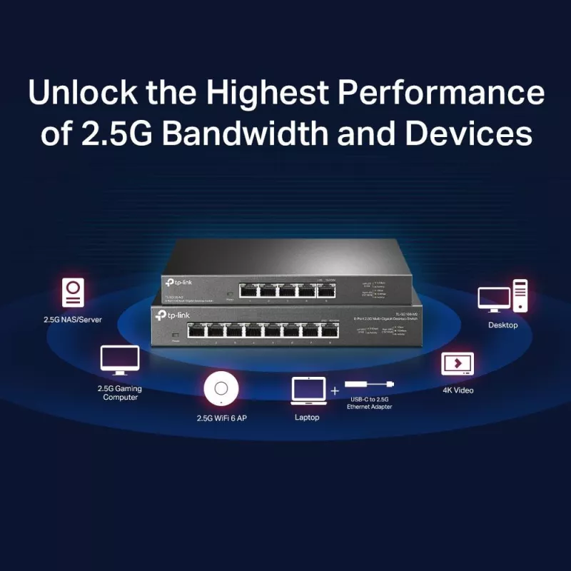 TP-LINK 5-PORT 2.5G DESKTOP SWITCH. SWITCH TYPE: UNMANAGED. BASIC SWITCHING RJ-45 ETHERNET PORTS TYPE: 2.5G ETHERNET (100/1000/2500), BASIC SWITCHING RJ-45 ETHERNET PORTS QUANTITY: 5. MAC ADDRESS TABLE: 16000 ENTRIES, SWITCHING CAPACITY: 25 GBIT/S. NETWOR