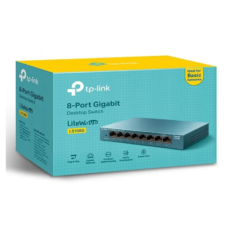 Series TP-LINK LS108G , LS108G , Type Unmanaged , Quality of Service (QoS) support Yes , 8xBasic switching RJ-45 Ethernet ports quantity , Basic switching RJ-45 Ethernet ports type Gigabit Ethernet (10/100/1000) , Switching capacity 16 Gbit/s , Forwarding rate 11.9 Mpps , Product colour Blue , Power source DC , Power supply included Yes , Width 158 mm , Depth 99 mm , Height 25 mm