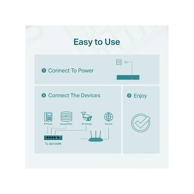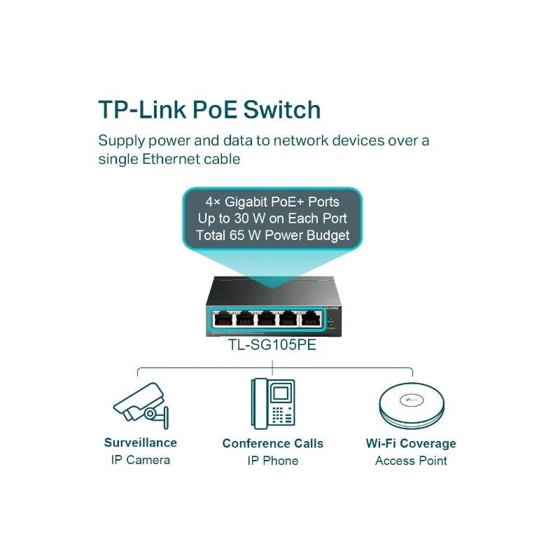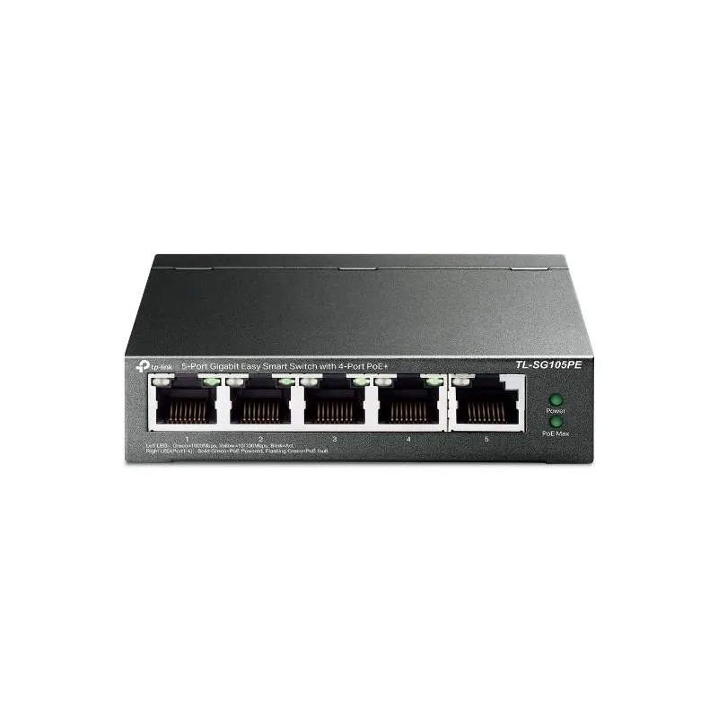 5-Port Gigabit Easy Smart PoE Switch with 4-Port PoE+ , Type Managed , Switch layer L2 , Quality of Service (QoS) support Yes , Web-based management Yes , 5xBasic switching RJ-45 Ethernet ports quantity , Basic switching RJ-45 Ethernet ports type Gigabit Ethernet (10/100/1000) , Port mirroring Yes , Switching capacity 10 Gbit/s , Forwarding rate 7.44 Mpps , Product colour Black , Power source DC , Power supply included Yes , Power over Ethernet (PoE) Yes , 4xPower over Ethernet plus (PoE+) ports quantity , Power over Ethernet (PoE) power per port 30 W , Total Power over Ethernet (PoE) budget 65 W , Width 99.8 mm , Depth 98 mm , Height 25 mm